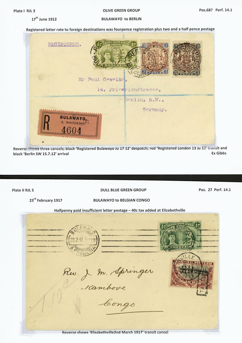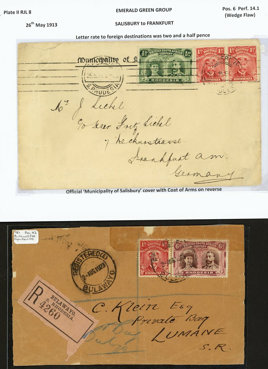 A group of covers (3) and a front, comprising 1912 Registered envelope to Germany bearing ½d. olive-green (RJL 3) used in combination with 1896-97 Arms 3d. and 1897 Arms 3d., 1917 envelope to Congo bearing ½d. dull blue green (RJL 5) insufficiently paid, taxed and with Belgian Congo 40c. added at Elizabethville, 1913 ½d. emerald-green in combination with Admiral 1d. pair on 'Official Municipality of Salisbury' envelope to Germany and envelope front Registered to Lumane, Southern Rhodesia bearing 6d. brown and purple in combination with Admiral 1d. (adhesives affected by sellotape at top); a good group (4)