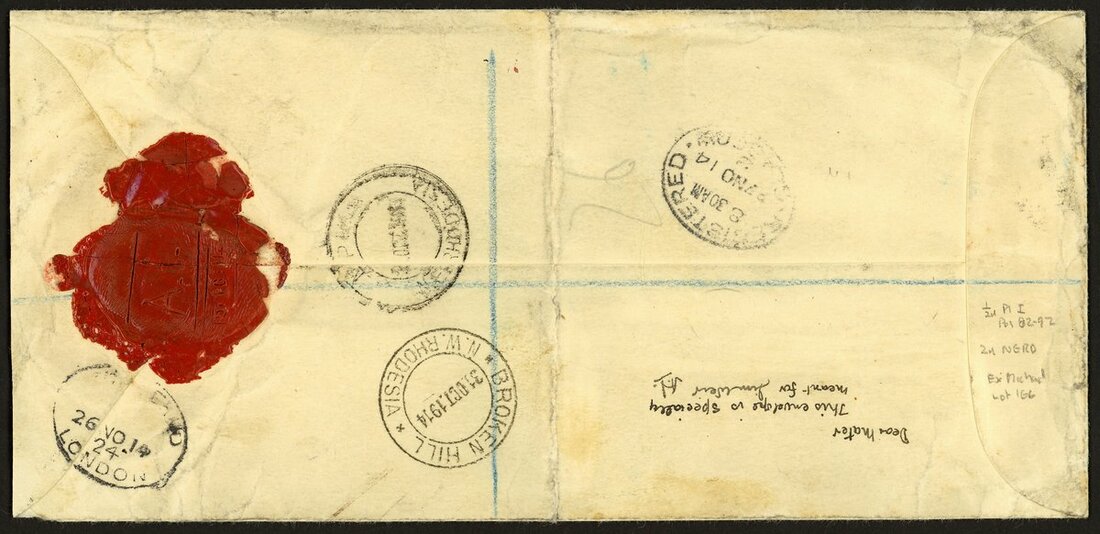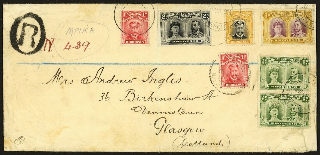 ½d. dull yellow-green vertical pair (RJL 1), 2d. black and slate-black (perf. 15) and 3d. magenta and yellow-ochre used in combination with Admiral 1d. (2) and 3d. tied to long envelope sent Registered from Mpika to Glasgow, manuscript Mpika Registration 'N 439' in red; John Michael noted (1976): "the cover from A. Ingles at Mpika, sealed with his thumb print in red wax, to his mother", the envelope creased affecting the 3d. and ½d. pair and with heavy central filing fold, still an attractive cover