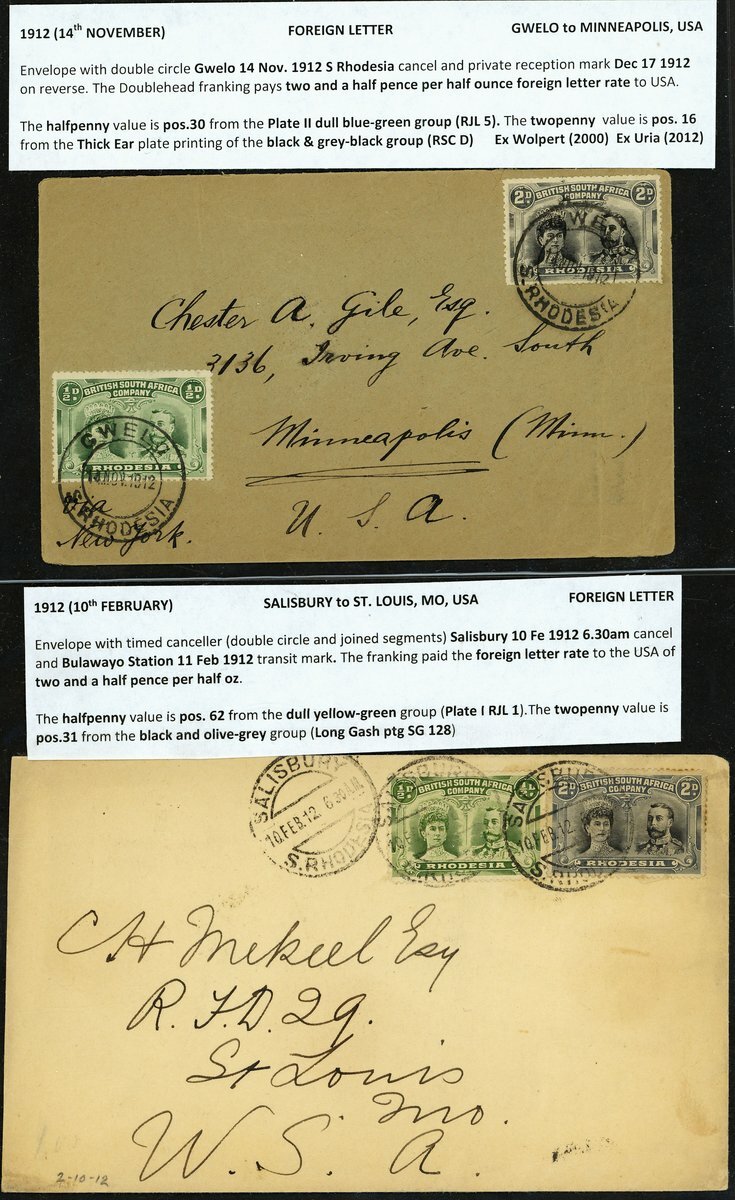 A pair of envelopes both bearing ½d. and 2d. and paying the foreign letter rate to the USA; the first bearing RJL 1 and S.G. 128 from Salisbury to St. Louis, Missouri and the second bearing RJL 5 and RSC D from Gwelo to Minneapolis, Minnesota (Ex Wolpert and Uria); fine