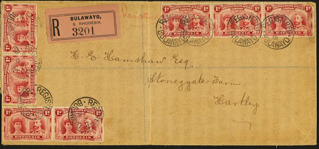 1d. carmine (7), a strip of three, a pair and two singles used on long Registered envelope to Hartley, Registered Bulawayo '3201'; fine