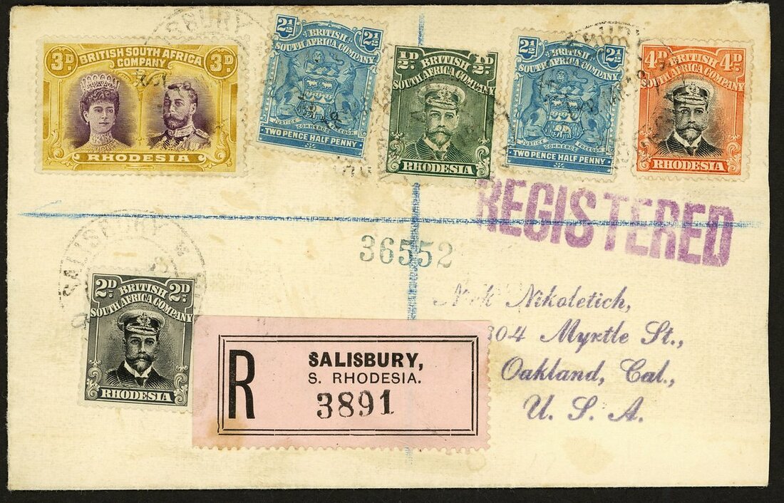 3d. violet and ochre, Thick Ear used with 1898 2½d. (2) and 1913-19 Admiral ½d. (small fault at top), 2d. and 4d., all neatly cancelled and tied by Salisbury double-ring datestamp on 1918 (18 Mar.) envelope registered to Oakland, California, bearing black on pink registration label and with U.S. "