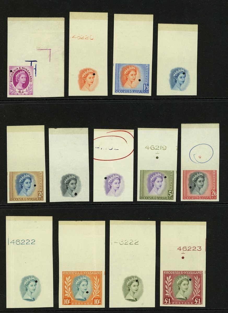 1954-56 ½d. to £1 imperforate plate proofs selection (28), each of the values with Waterlow security punch, including head only and full impressions for 6d. to £1, also noting 2d. pair and 2½d. block of four. A fine and attractive group.