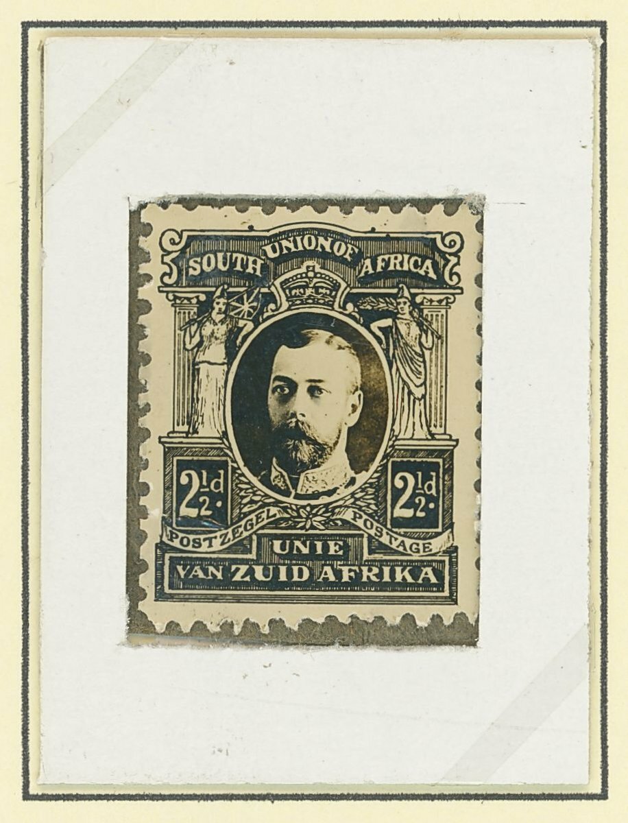 A photographic essay of the award-winning entry of a 2½d. design by E.A. Nicolai; stamp-sized, perforated and affixed to small piece of card with non-contemporary white mount laid over the top (47 x 34mm.); fine and rare