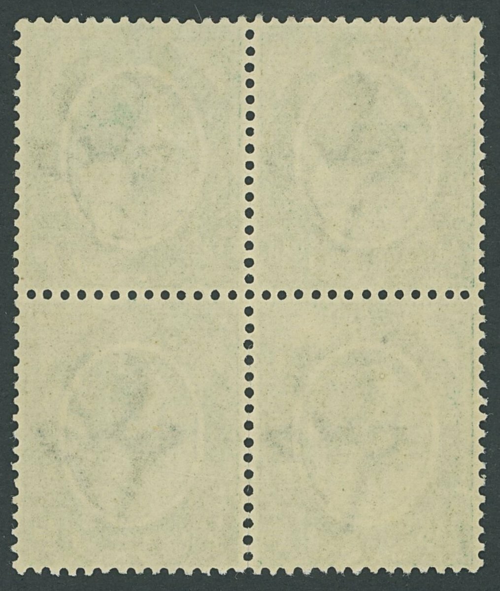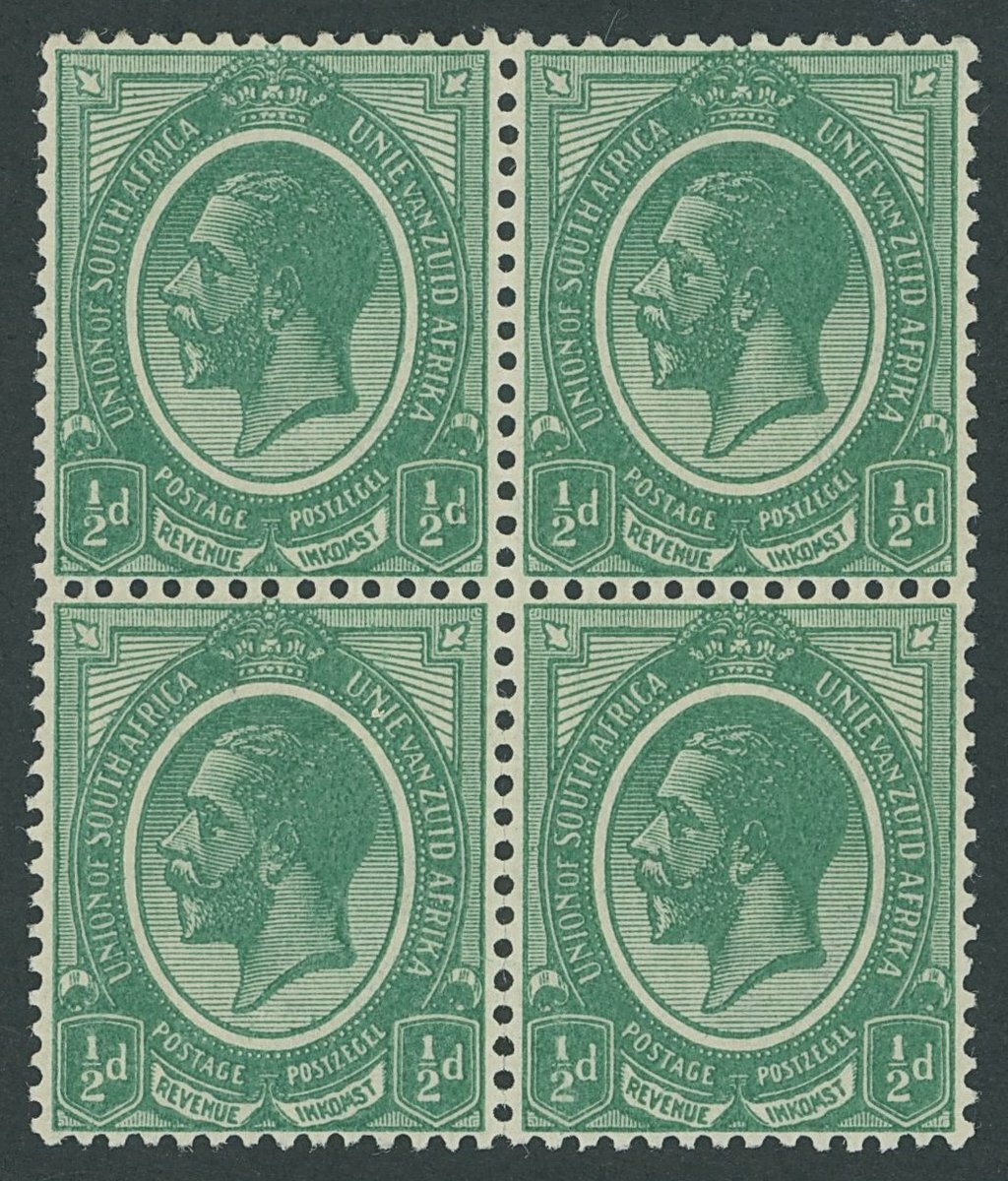 ½d. dark mossy green, a block of four; slight perforation separation at the foot, superb unmounted mint; a very rare multiple of this distinctive shade. B.P.A. Certificate (2017). S.G. 3 var, SACC 2e