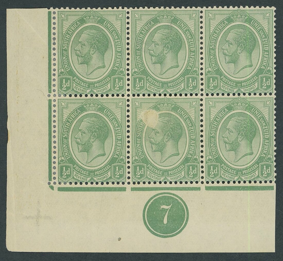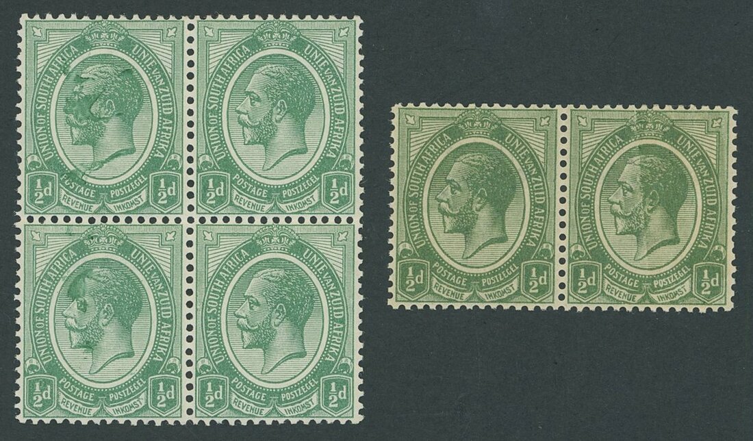A group of mutliples (3) with printing flaws comprising horizontal pair, the right hand stamp with inking variation caused by paper adherance on reverse, block of four with ink splashes affecting the King's head on left vertical pair and plate '7' block of six, one stamp affected by intrusion udring the printing process leaving an area unprinted; fine and striking printing varieties. P.F.S.A. Certificates for all three. S.G. 3 var.