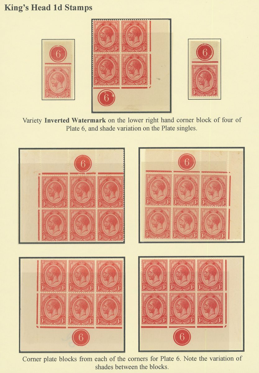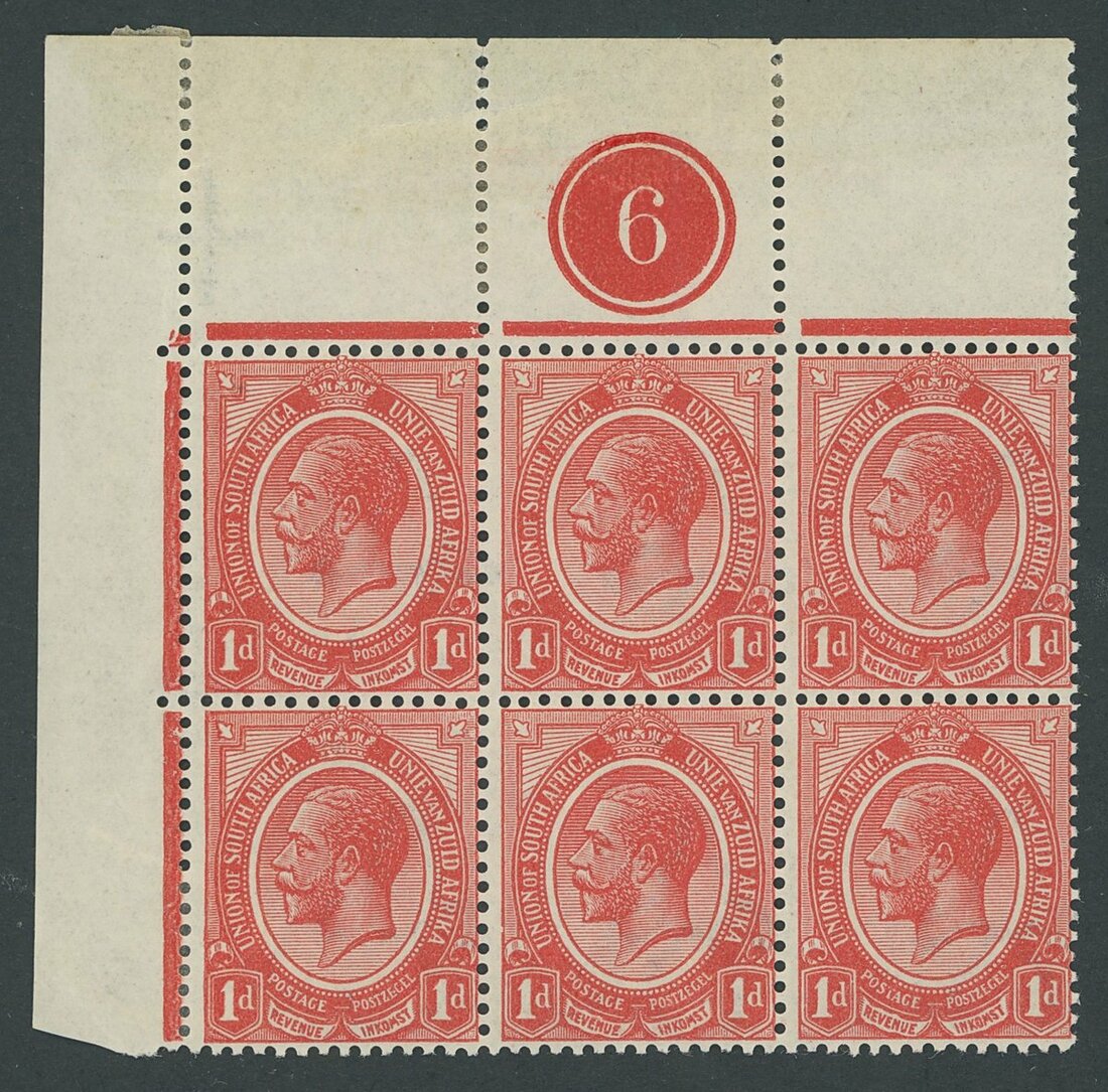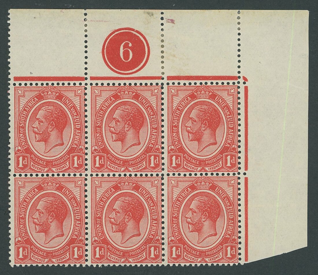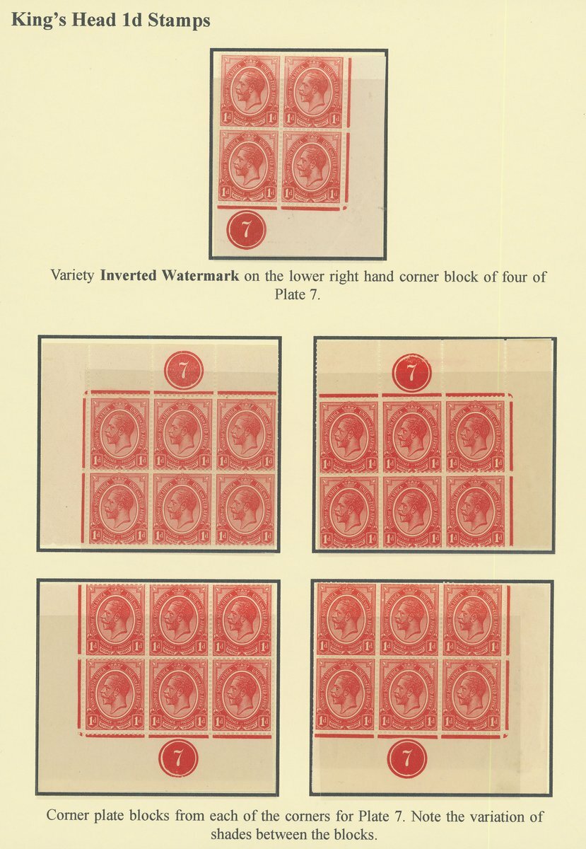 A group of mainly plate number blocks written up on album pages comprising Plate 3 with corner blocks of six from all four corners of the sheet (4) and a further block with watermark inverted, Plate 4 with corner blocks of six from all four corners of the sheet (4) and a further corner block of four, Plate 6 with corner blocks of six (8, two from each corner of the sheet), further blocks of four, six and twelve (2, including one with downward shift of watermark resulting in the top row with no watermark) and a block of four and two singles with watermark inverted, Plate 7 with corner blocks of six from each corner of the sheet (4) a further block of four and a block of ten, also blocks of ten and twelve with no plate number, a few postal stationery cards and an unofficial 1d. bisect on cover; a good to fine lot