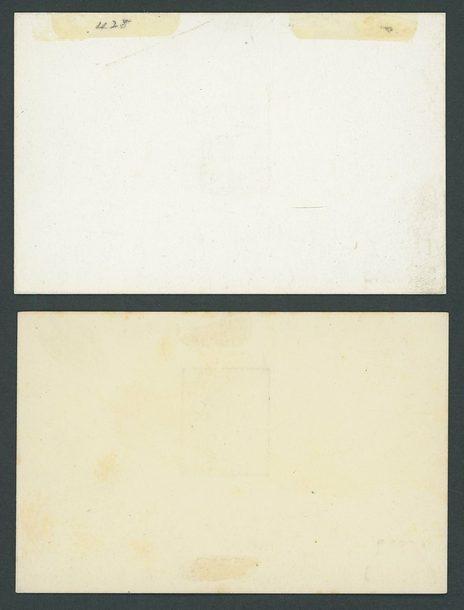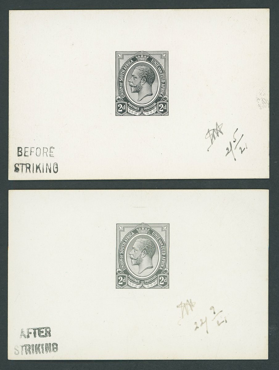 Die proofs of the completed design in black on white glazed card (2) (82 x 60mm.), the first marked