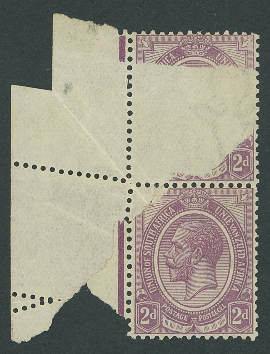 A vertical pair from the left of the sheet printed on defective paper with part of the marginal gummed side folded over during printing resulting in a spectacular error of printing and perforation, with the majority of the upper stamp design printed on the gummed side and leaving the upper stamp only partly printed; striking and very rare
