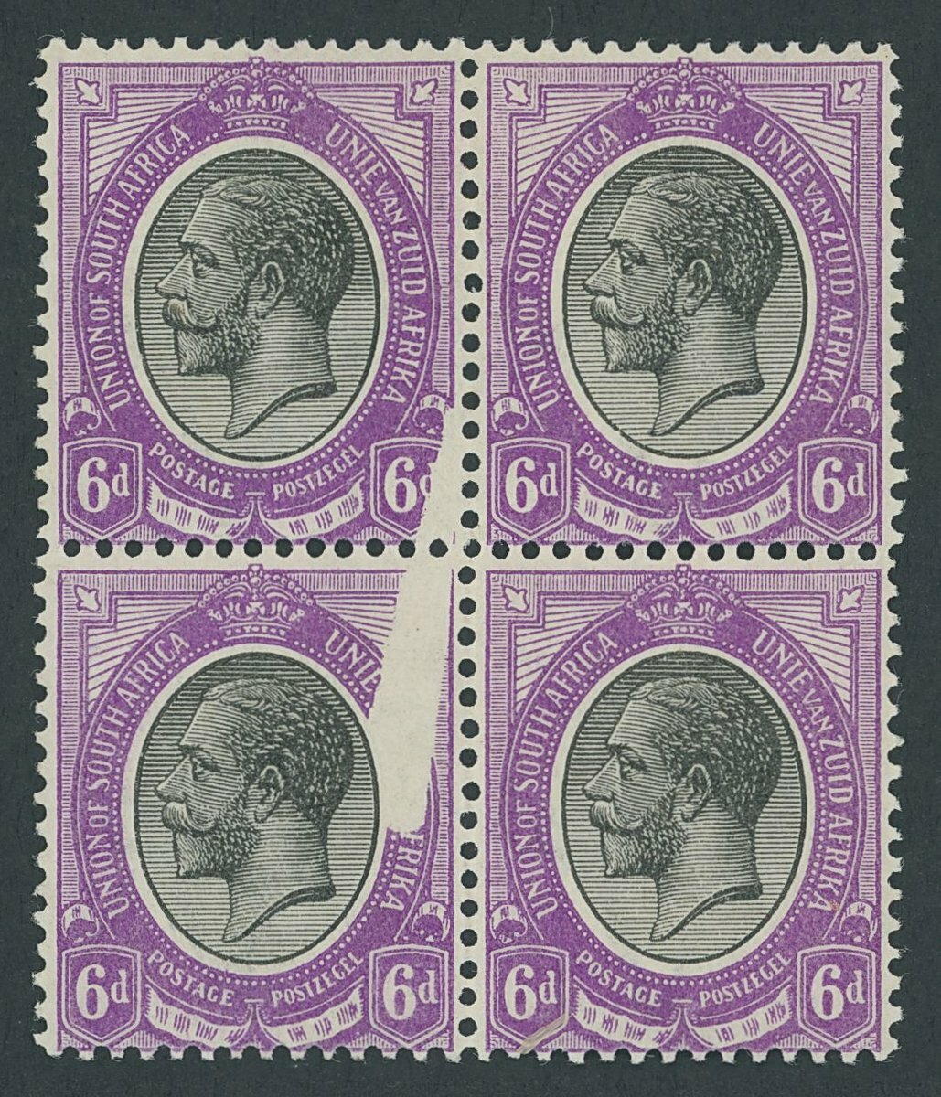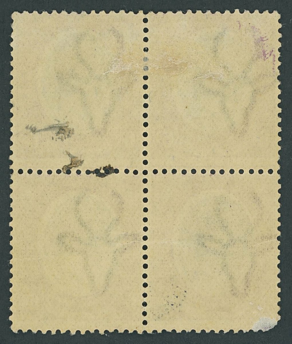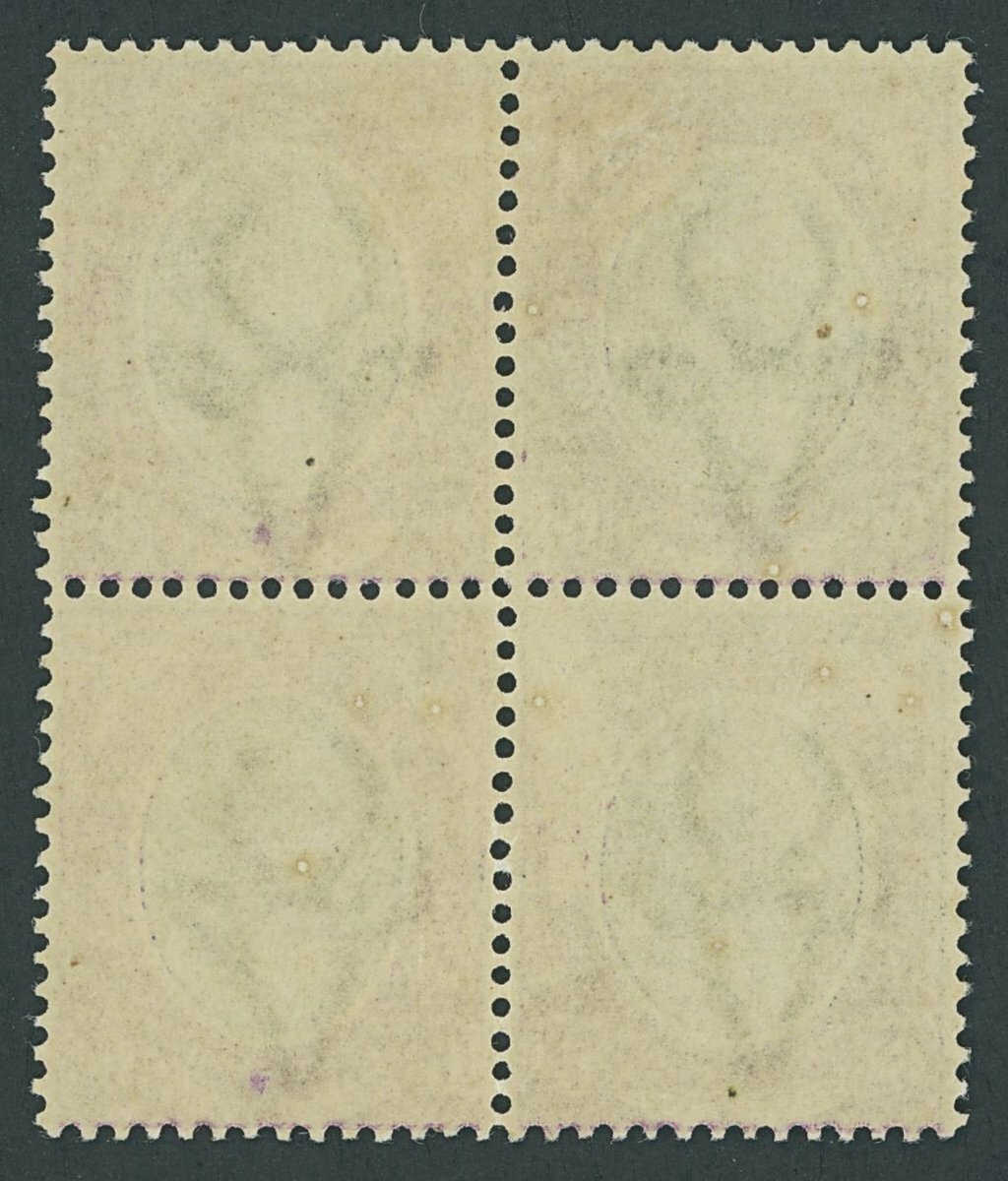 A small group of mutliples with varieties (3) comprising a pair from the right of the sheet, the top stamp partially printed as a result of a foreign object on the printing press, a block of four in a bright shade with the same error affecting the first vertical pair and a block of four with all stamps showing variety new moon, some black ink splashes at foot and one stamp thinned; a good group of striking varieties (3)
