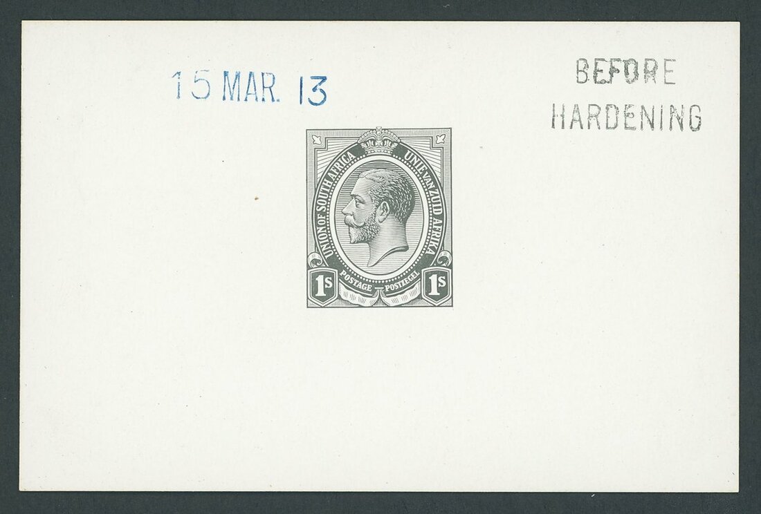 1/- completed die proof in black on white glazed card (82 x 60mm.) marked