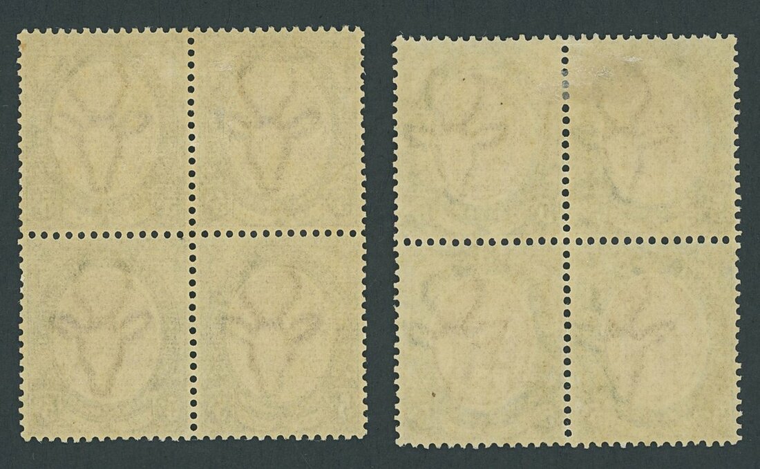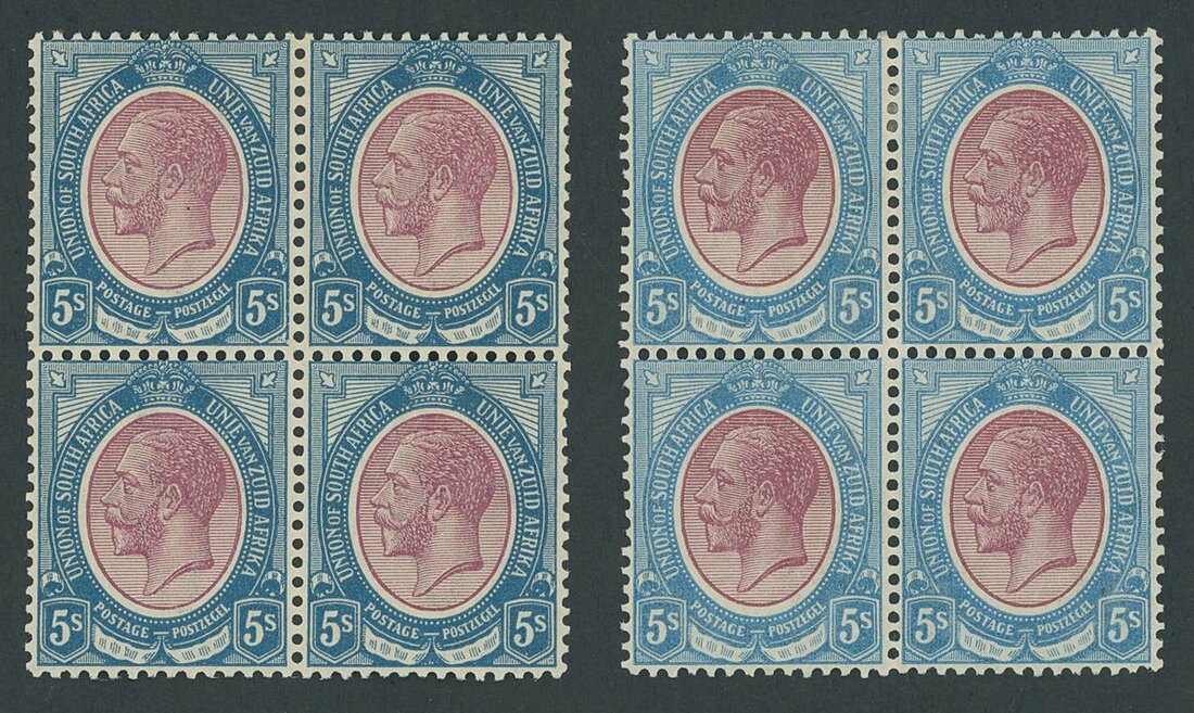 5/- purple and blue, two blocks of four in differing shades, one showing variety broken horn in watermark; fine mint