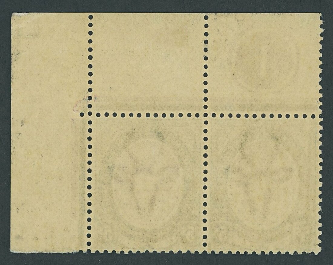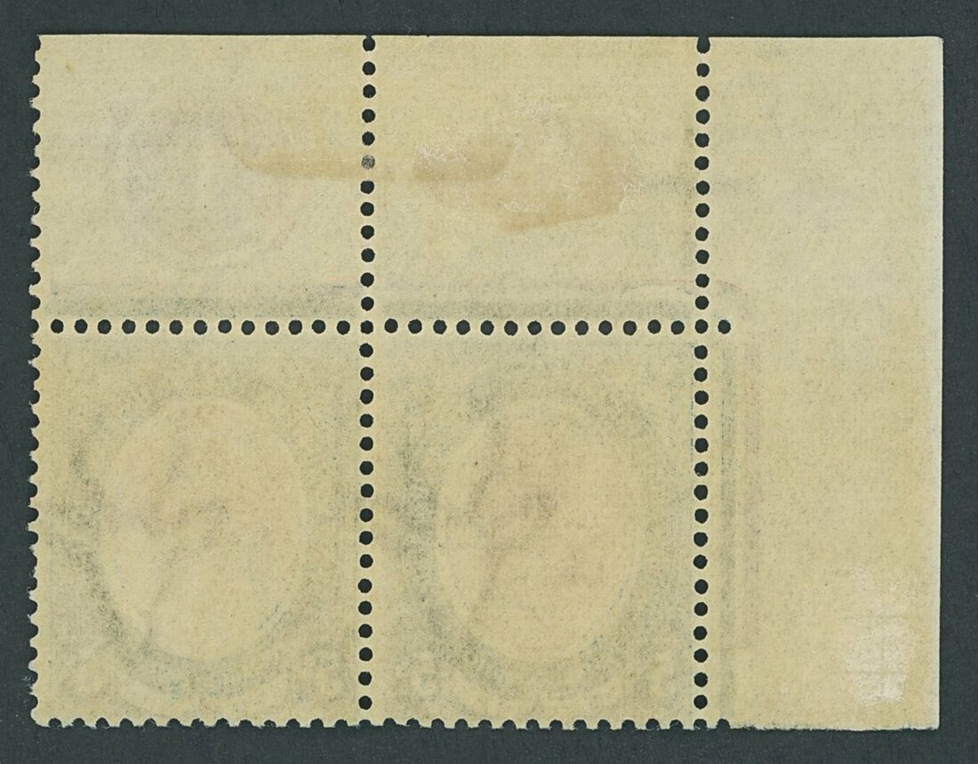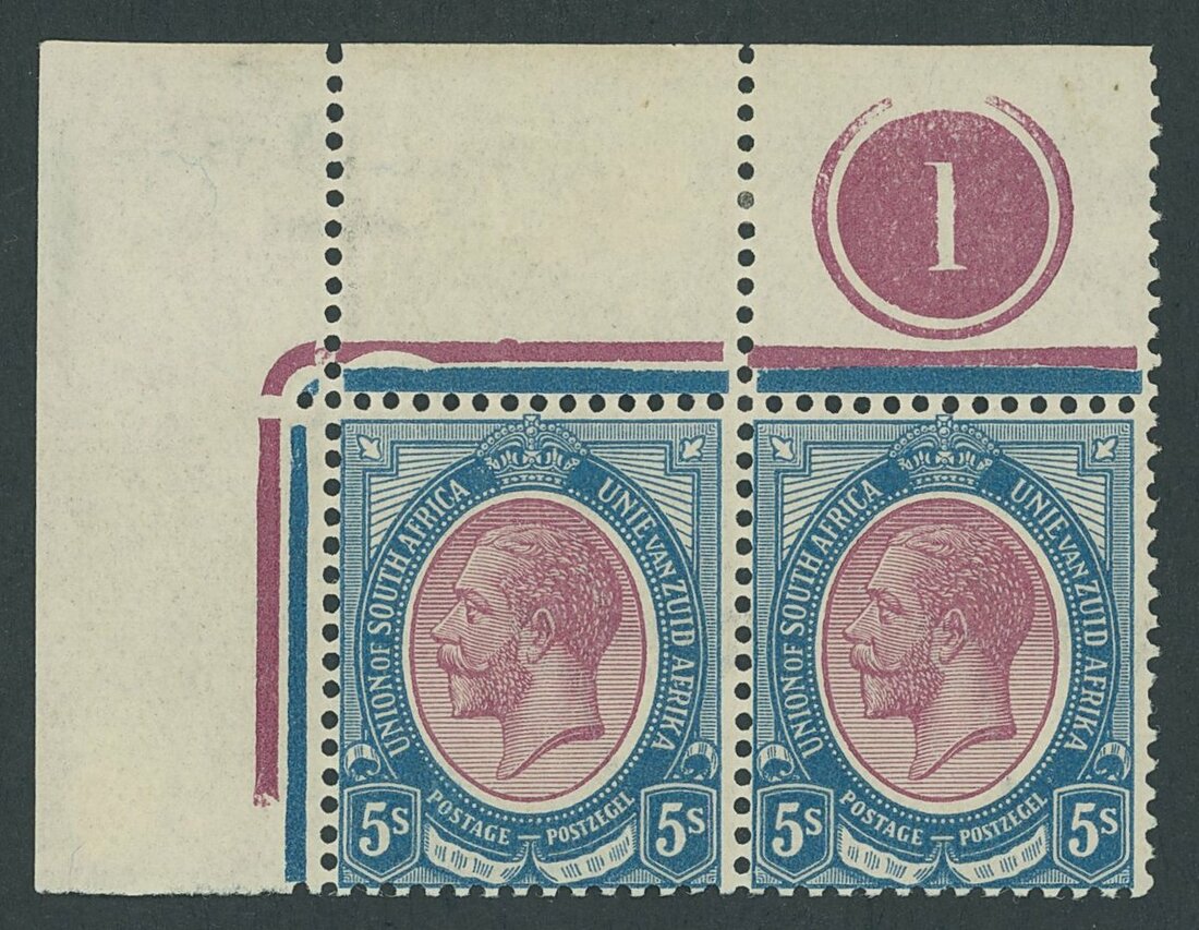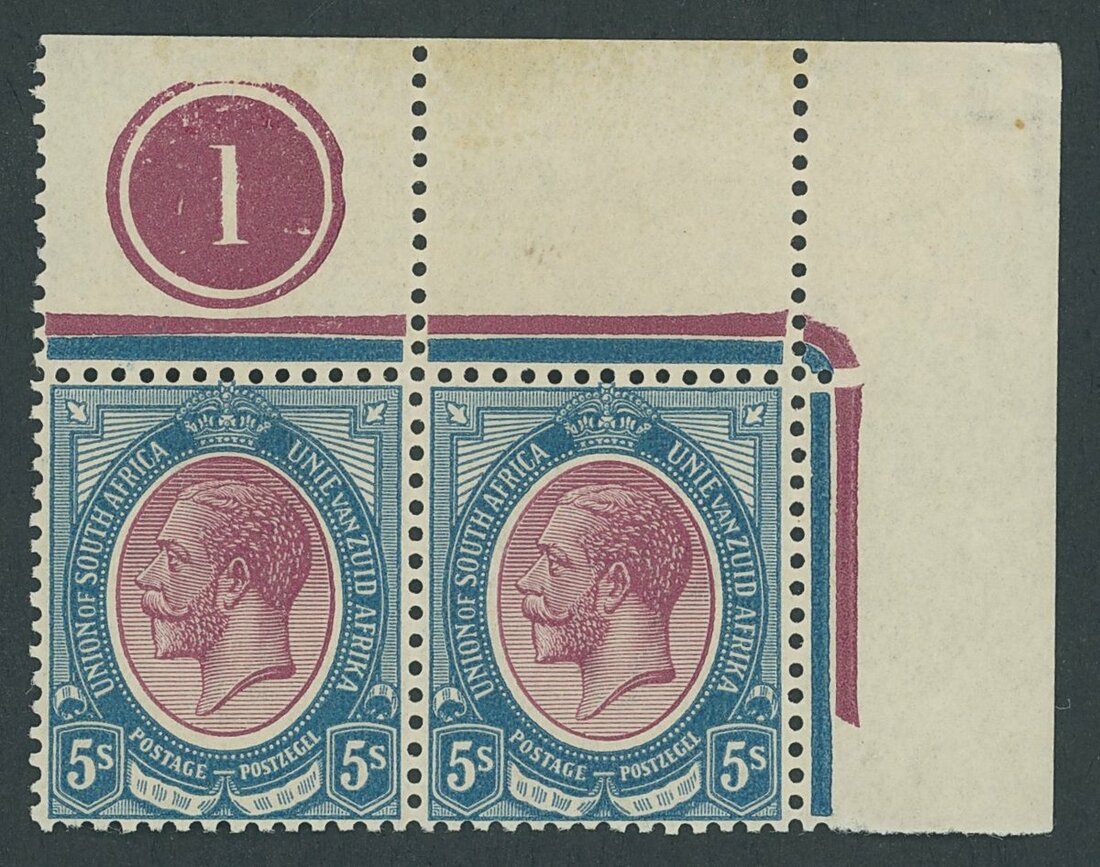 5/- purple and blue, lower-left and lower-right corner plate '1' pairs, large part original gum; fine