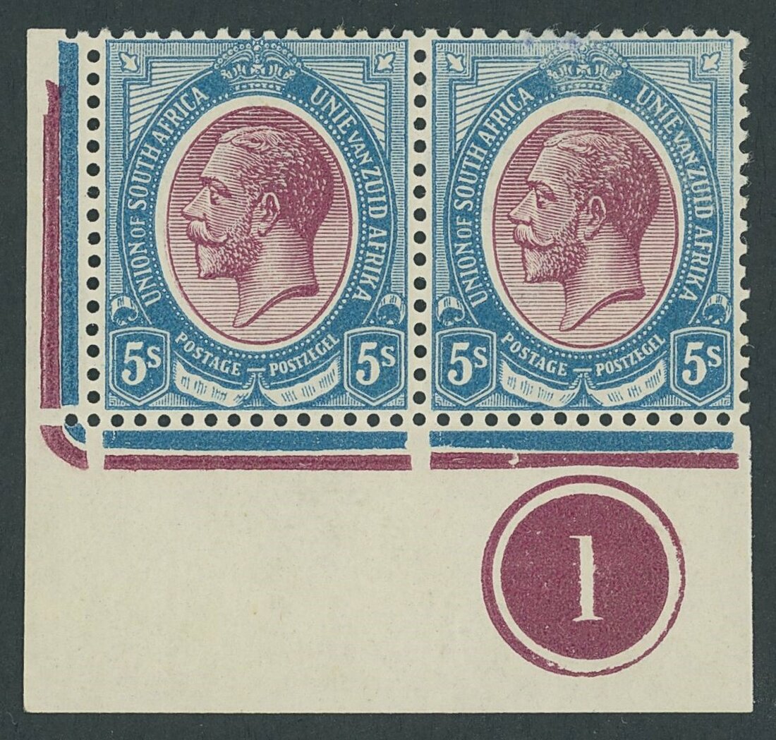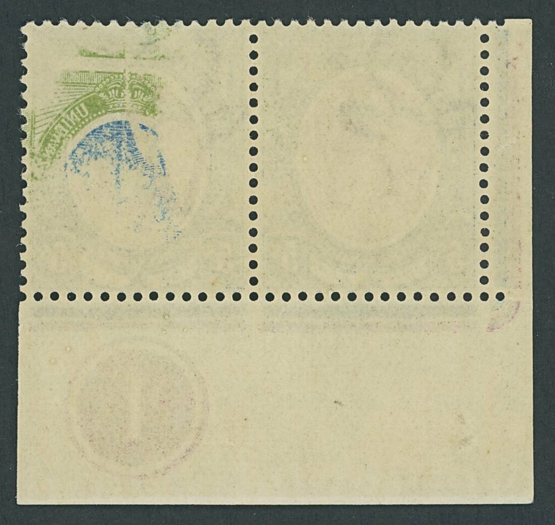 5/- purple and blue, plate '1' corner pair from the lower-left corner of the sheet with trimmed margin at left; some light ink offset from a 10/- on the reverse, fine. S.G. 15