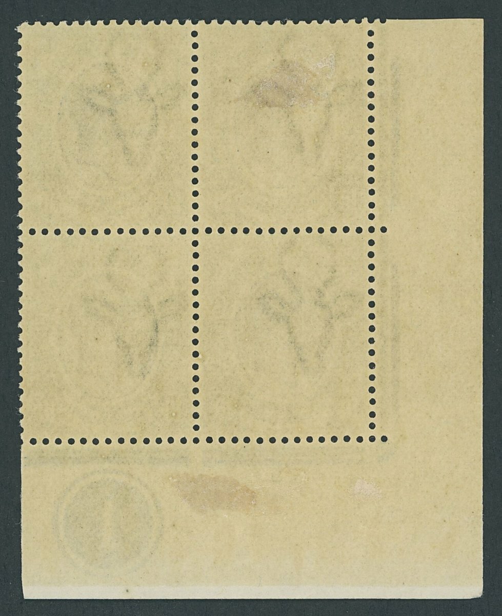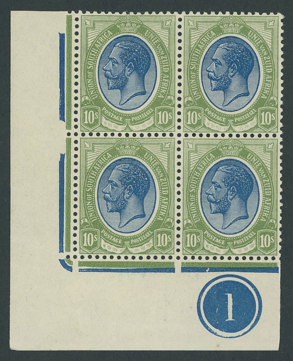 10/- deep blue and olive-green, plate '1' block of four from the lower-left corner of the sheet; lightly mounted mint, fine and rare. S.G. 16