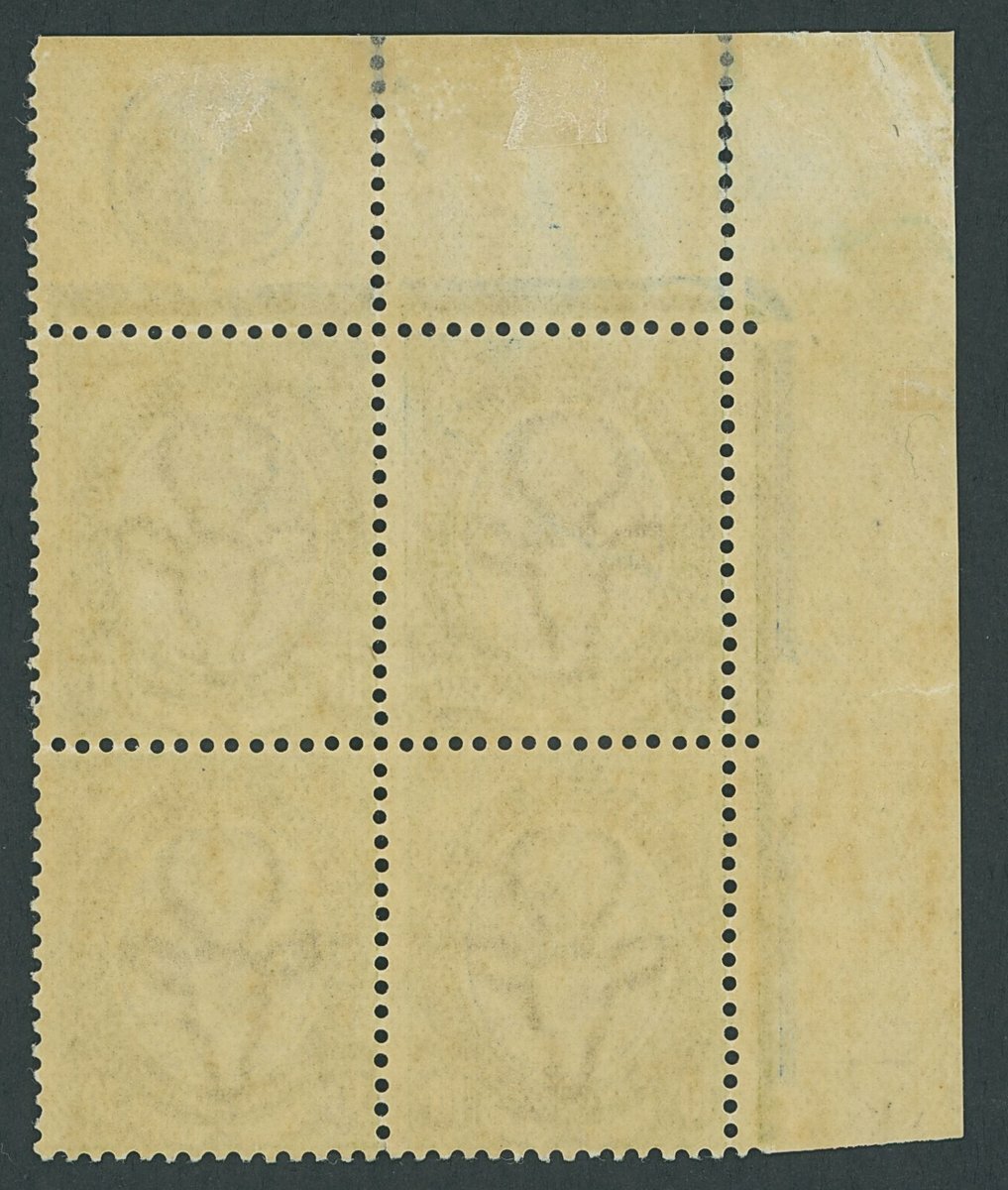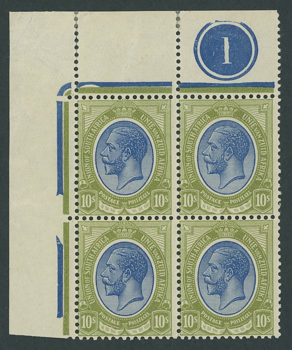 10/- deep blue and olive-green, an upper-left corner plate '1' block of four; light gum bend affecting the upper left stamp only, unmounted mint, fine and rare. S.G. 16