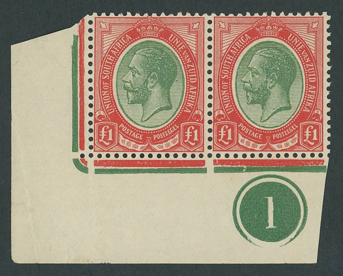 £1 green and red, a lower-left corner plate number '1' pair, superb unmounted mint. S.G. 17