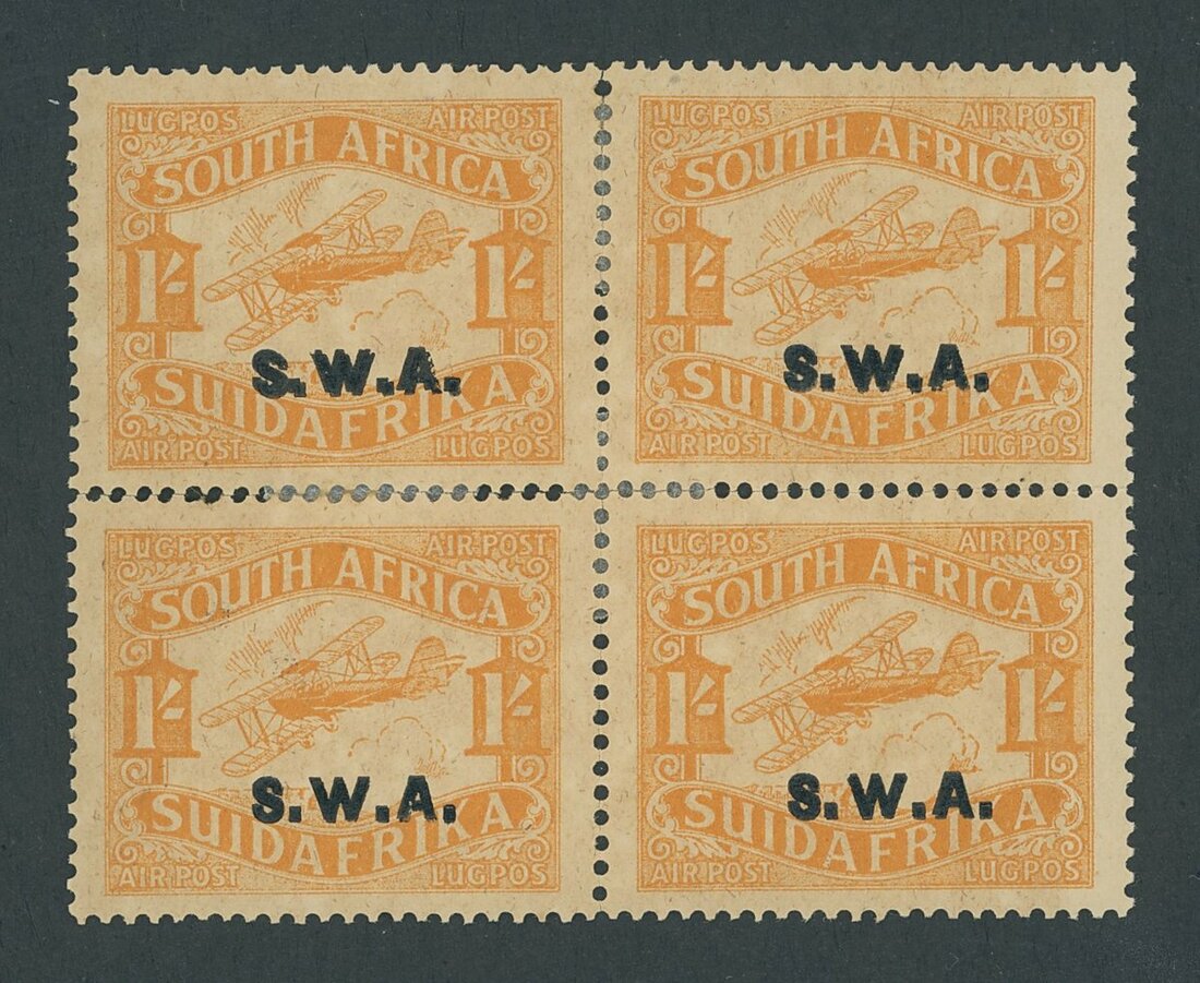 1930 Air 1/- orange, a block of four all showing variety overprint double, the upper pair with a particularly clear doubling; the block with some perf. reinforcement and with some gum toning and light soiling, still an attractive and rare multiple. S.G. 73a, £2,200