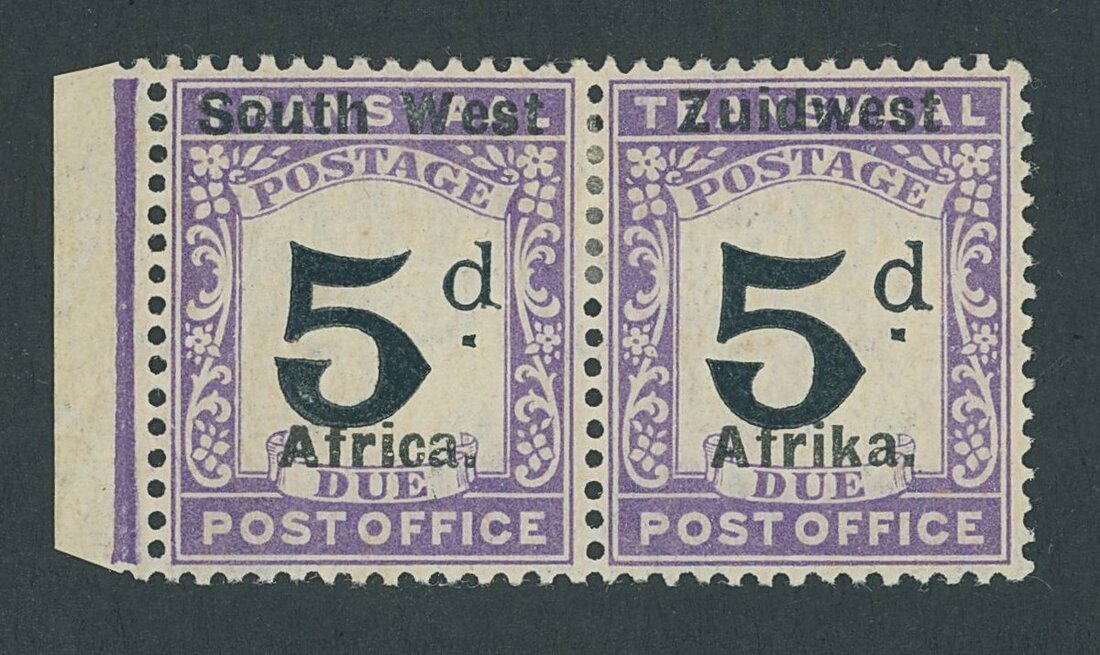 1923 Postage Due, 5d. black and violet, Setting IV, bi-lingual pair from the left of the sheet, large part original gum; fine and scarce. S.G. D17a, £950