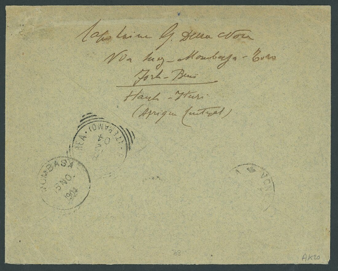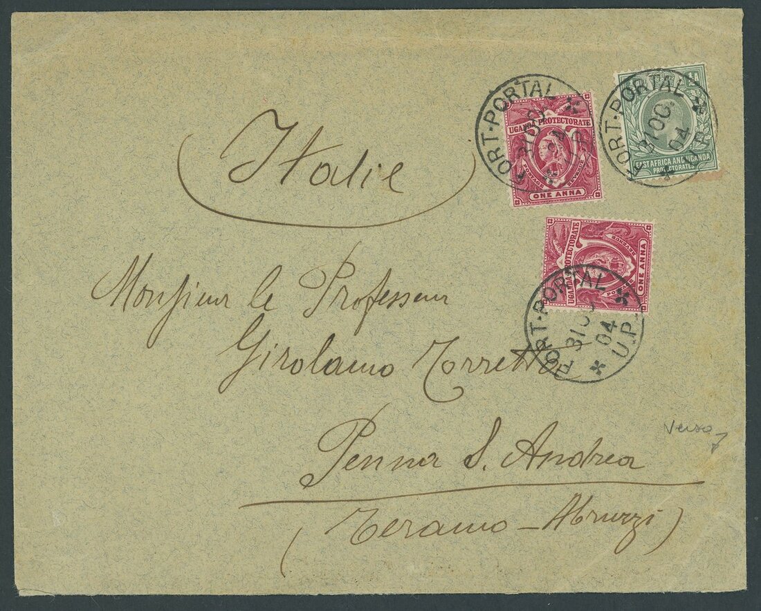 1904 (31 Oct.) envelope from Fort Portal addressed to Penna S. Andrea, Italy bearing Uganda 1898-1902 1a. (2) and East Africa and Uganda Protectorates ½a. cancelled by neat despatch c.d.s. The reverse wit Mombasa (15.11) and arrival (8.12) c.d.s. Some peripheral creasing, still quite fresh and scarce.