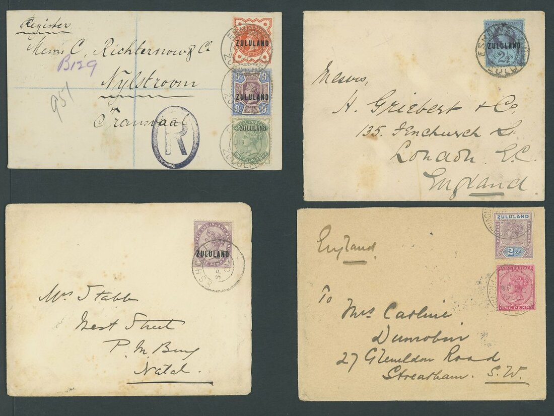 1888-96 group of envelopes (4) comprising 1888 envelope to Natal bearing 1d. deep purple, 1891 envelope to England bearing 2½d. purple on blue and 1896 envelope Registered to Transvaal bearing ½d. vermilion and 9d. dull purple and blue used in combination with ½d. dull green without stop and 1900 envelope to London bearing Natal 1d. in combaination with 1894-96 2½d., all are tied to envelopes by