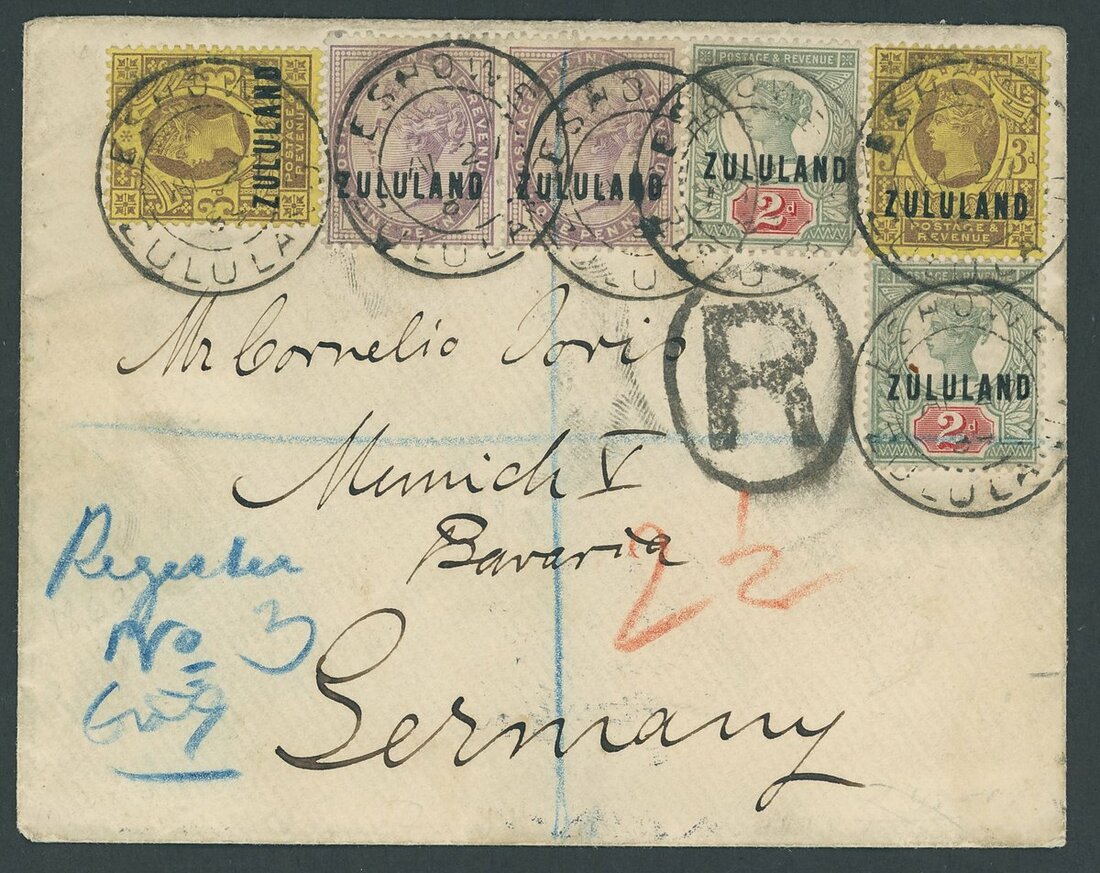 1890 (27 Apr.) envelope sent Registered to Germany bearing 1888-93 1d. (2), 2d. (2) and 3d. (2) all cancelled and tied to envelope by