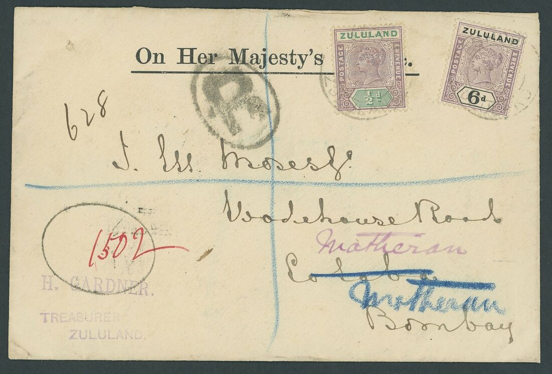 1896 (14 Apr.) O.H.M.S. envelope sent Registered to Bombay, India bearing 1894-96 ½d. and 6d. tied by light