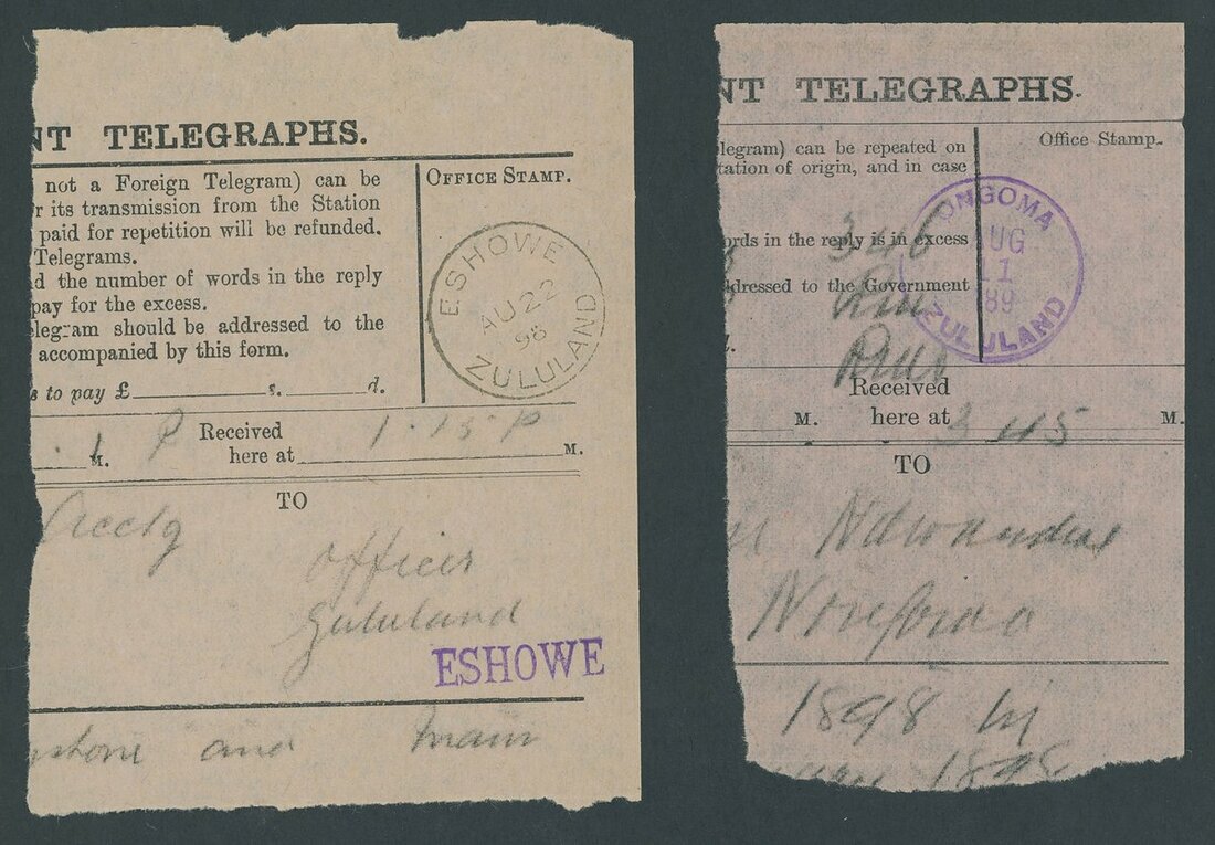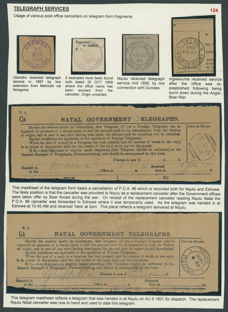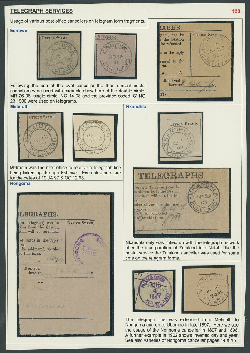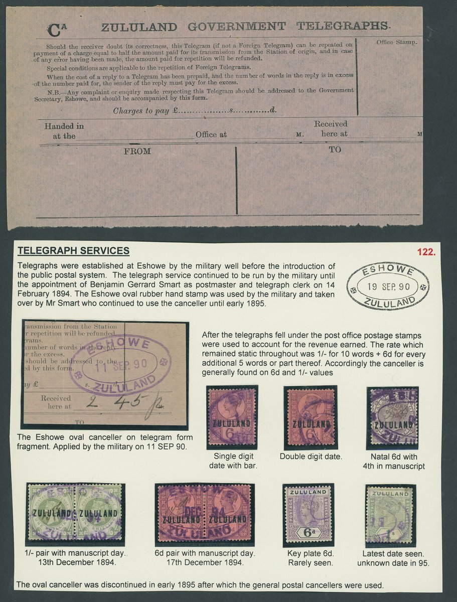 1894-96 Telegraphs collection on pages including an unused Telegraphs form, a range of stamps with telegraphic cancellations (15) with values to 1/-, various post office cancellers used on telegram form fragments (20) and two very rare covers, one the only surviving example of an