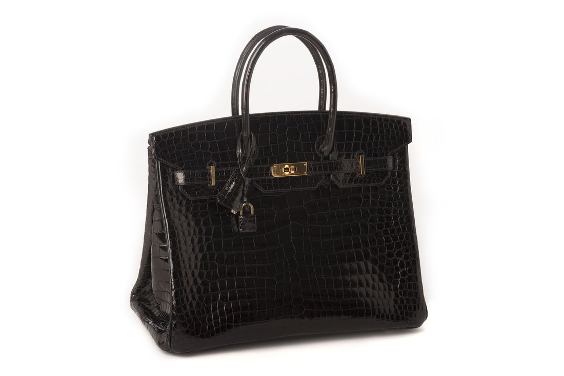 Sac "Birkin" 35 cm en crocodile porosus (crocodylus porosus) noir, garniture en métal plaqué or, tirette, clochette, clefs, cadenas gainé, doublure en chèvre rouge comprenant une poche à fermeture sur glissière, une poche plaquée, double poignée.
