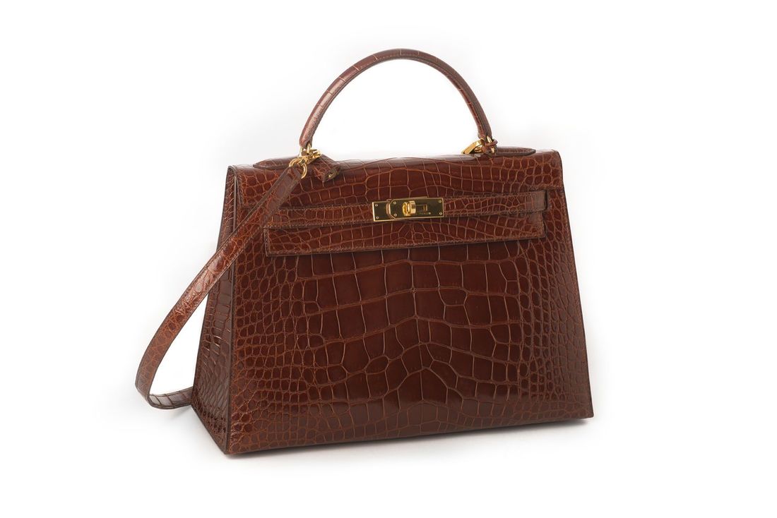 Sac "Kelly" 32 cm en Alligator (alligator mississippiensis) Havane, garniture en métal plaqué or, tirette, clochette, clefs, cadenas gainé, doublure en chèvre comprenant une poche à fermeture sur glissière, une double poche à soufflet, poignée.