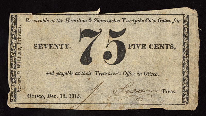 NY. Otisco. Onondaga County. Hamilton & Skaneatelas Turnpike. 75 Cents. Large 75 at center. Dec. 15, 1815. (H9). Fine, stamp hinges on back. R6.