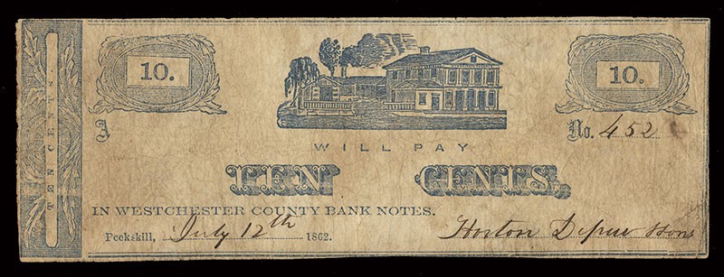 NY. Peekskill. Westchester County. 10 Cents. July. 12, 1862. (H10). Horton Depew & Sons. Blue. Large building. Fine. R5.