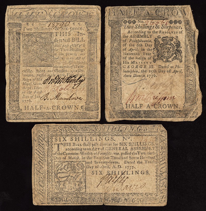 Pennsylvania Trio. 1) Jan. 1, 1776. 2 Shillings 6 Pence. VF. 2) Apr. 25, 1776. 2 Shillings 6 Pence. VF. 3) Apr. 10, 1777. 6 Shillings. F-VF. Corners crumpled but present. [3]