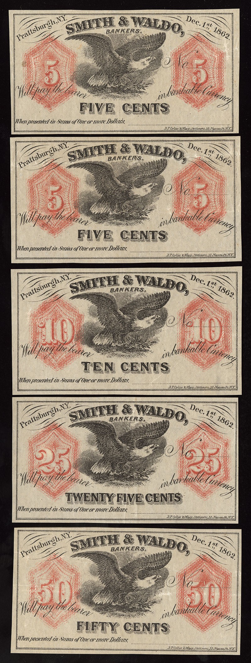 NY. Prattsburgh. Steuben County. Smith & Waldo. Red. Eagle. 5(2), 10, 25, 50 Cents. Dec. 1, 1862. (H5-8). All VF. Unissued. [5]