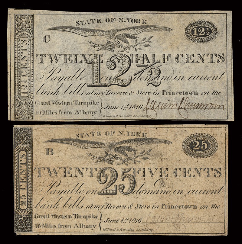 NY. Princetown. Schenectady County. Calvin Cheeseman. Eagle. Great Western Turnpike. Both June 1, 1816. 1) 12 ½ Cents. (H21) Plate C. VF. 2) 25 Cents. (H24). R5. Fine. [2]