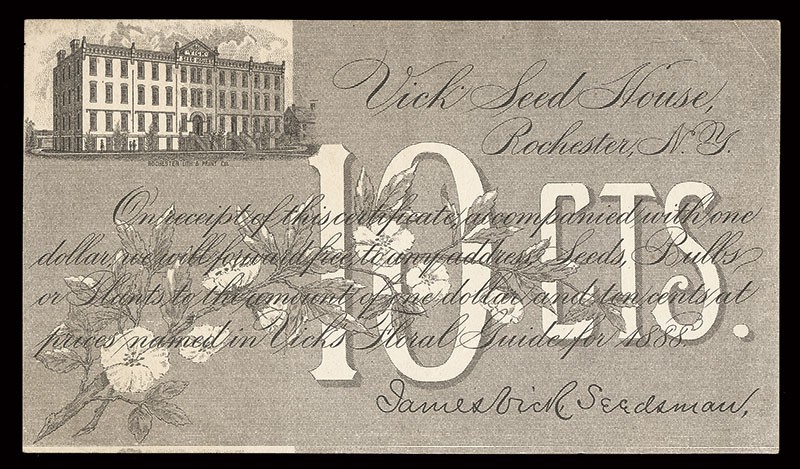 NY. Rochester. Monroe County. 10 Cents. 1888. Vick Seed House. Building, flowers. VF-EF. James Vick was a pioneering nursery man who helped Rochester become "Flower City."