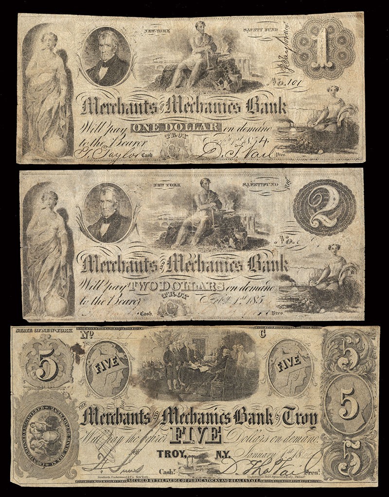 NY. Troy Trio of Obsoletes. 1) Merchants & Mechanics Bank. $1. 1854. (S5). Fine detail, minor edge repairs. 2) Similar. $2. 1853. About Fine. 3) Merchants & Mechanics Bank of Troy. $5. (C72a). About Fine, stains. [3]