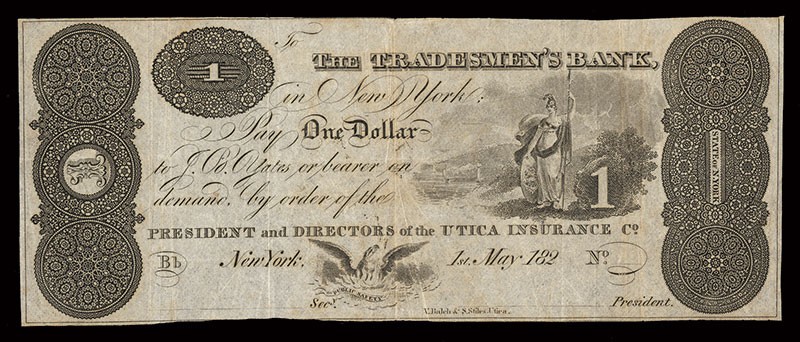 NY. Utica. Utica Insurance Company on Tradesmen's Bank. $1. 182_. (H1068). Minerva with spear. Phoenix, below. V. Balch & Stiles. R7. VF remainder.