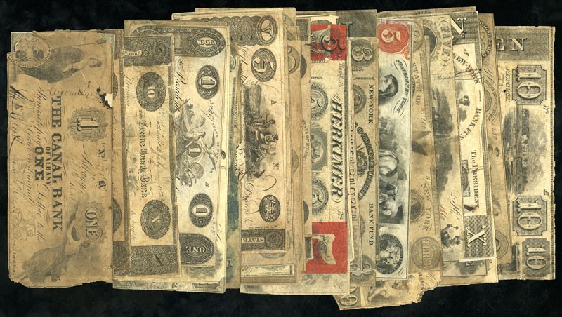 NY. Large Group of Mostly New York Counterfeit Obsolete Notes. All with impairments (tears, stains, pieces out, etc.). A wide assortment including Canal Bank of Albany; Rathbun $3 (Buffalo); Greene County Bank (Catskill); Central Bank (Cherry Valley); Chester Bank; Bank of Coxsackie; Bank of Dansville; Bank of Fishkill; Bank of Geneva; Genesee Valley Bank; Bank of Hudson; Bank of Ithaca; Montgomery County Bank (Johnstown); Essex County Bank (Keeseville); Ulster County Bank (Kingston); Bank of Landsingburgh; Herkimer County Bank (Little Falls); Exchange Bank at Lockport; Bank of the People (Lowville); Bank of Chenango (Norwich); Ogdensburgh Bank; Stissing Bank (Pine Plains); Merchants Bank (Poughkeepsie); Farmers Bank of Seneca County (Romulus); Rochester Bank; Bank of Sing Sing $10 (Proof missing large pieces); Bank of Troy; Manufacturers Bank of Troy; Farmers Bank of Troy; Union Bank of Troy; Bank of Utica; Ontario Bank; Black River Bank (Watertown); Bank of Westfield. Watervliet (Troy). Additional notes from the same bank, and some duplicates are also included. Sold as is. No returns. [40]