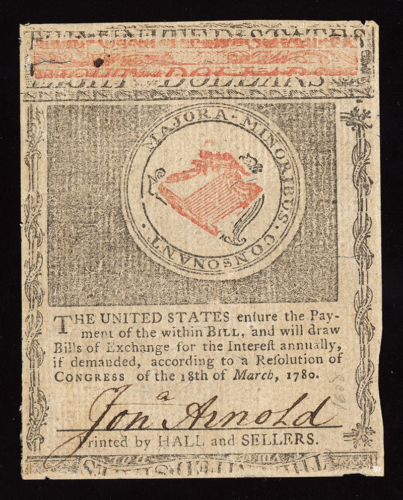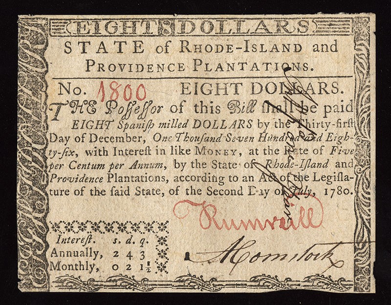 Rhode Island. July 2, 1780. $8. (RI-288) No.1800. "CONFEDE" / "RATION" watermark. "Int pd one year" penned near the right end. Red and black back with harp, signed by Jonathan Arnold. Uncirculated. Sharp, crisp signatures and excellent paper quality. Not cancelled.