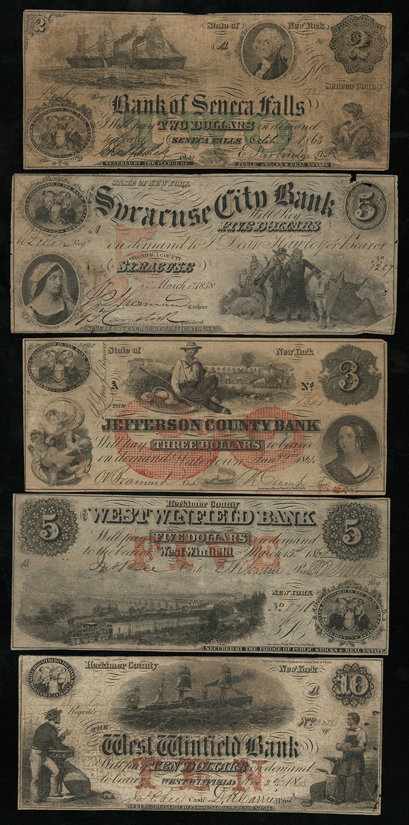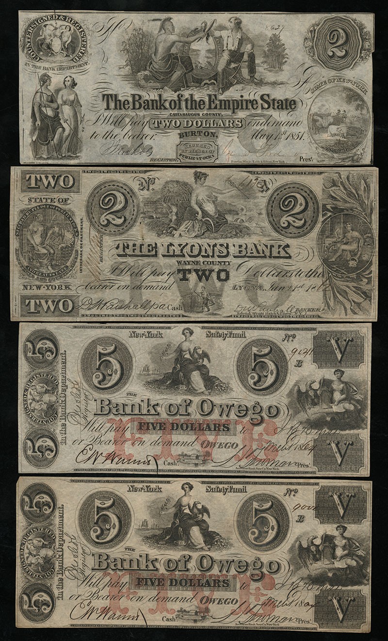 NY. Attractive Assortment of Nicer Counterfeit Obsolete Notes. 1) Burton -Fairport. Bank of the Empire State. $2. 1854. (C10). AU, trimmed in a bit, left. 2) Lyon's Bank. $2. 1862. (C4). F-VF. 3-4) Bank of Owego. $5. 1864. Red. Both F-VF. 5) Bank of Seneca Falls. $2. 1863. (S5). Green. Fine. 6) Syracuse City Bank. $5. (S5). Red. VG, small piece outs. 7) Watertown -Adams. $3. 1864. (C142c). Jefferson County Bank. Red. F-VF, some pin holes. 8) West Winfield Bank. $5. 1862. (C6c). Fine, mark on back. 9) Similar. $10. 1863. (G8b or C8b). Difficult to tell in this grade. Fine, minor stains. [9]