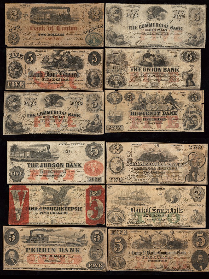 NY. Colorful Grouping of Counterfeit Obsolete Notes. 1) Bank of Canton. $2. 1863. (S5). About Fine, corner tip missing. 2) Bank of Fort Edward. $5. (S5a). VG detail, repairs. 3-4) Commercial Bank of Glen's Falls. $5. 1858; 1861. Both VG with repairs. 5) Union Bank of Monticello. $5. 1862. (C8b). Fine. 6) New Paltz. Union Bank. $5. 1861. (C6). VG. 7) Ogdensburgh. Judson Bank. $5. 1860. (S5). Fine. 8) Bank of Poughkeepsie. $5. 1861. (C66b). VG, small pieces out. 9) Rochester. Perrin Bank. $5. 1860. Small diamond cancel, crayon on back, else Fine. 10) Commercial Bank of Saratoga Springs. $2. 1860. (C4b). About Fine, small repaired edge splits. 11) Bank of Seneca Falls. $2. (S5). Fine detail, corner restored. 12) Trumansburgh. Henry D. Barto. $5. 1862. (S5). VG. [12]