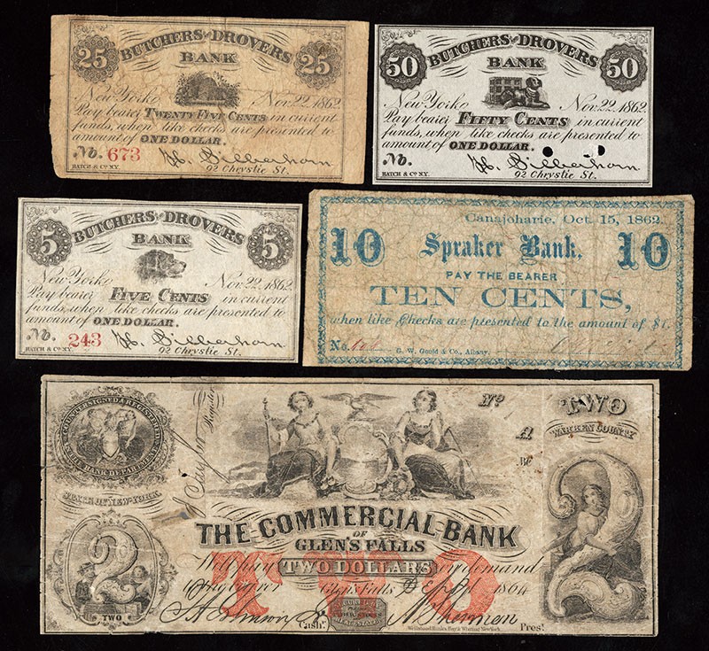 1) Canajoharie. McKinstrey on Spraker Bank. 10 Cents. Blue. (H21) VG. 2) Commercial Bank of Glen's Falls. $2. 1864. Women flank shield. Red. TWO. (C8b) Fine. 3-5) Silverhorn - Butchers & Drovers Bank. 5 Cents. Fine; 25 Cents. VG; 50 Cents. Unc. POC. Remainder. [3]