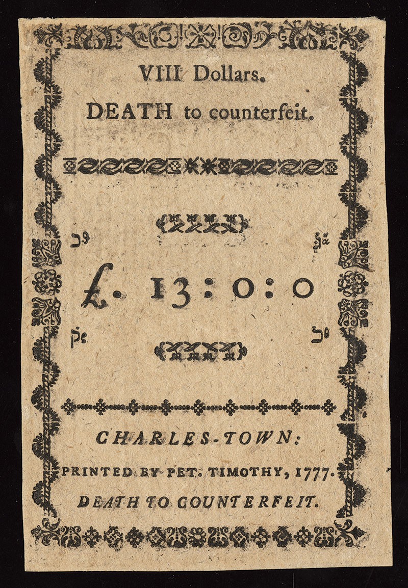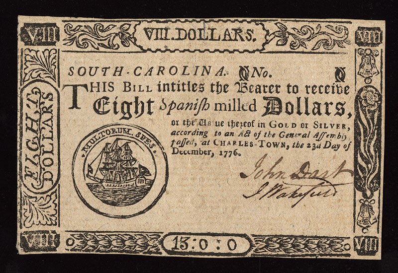 South Carolina. December 23, 1776. $8. (SC-141) Sailing ship in circle. Hebrew letters on back as counterfeit protectors. Signed by Dart and Wakefield. Uncirculated. Unissued remainder. Fresh and crisp.