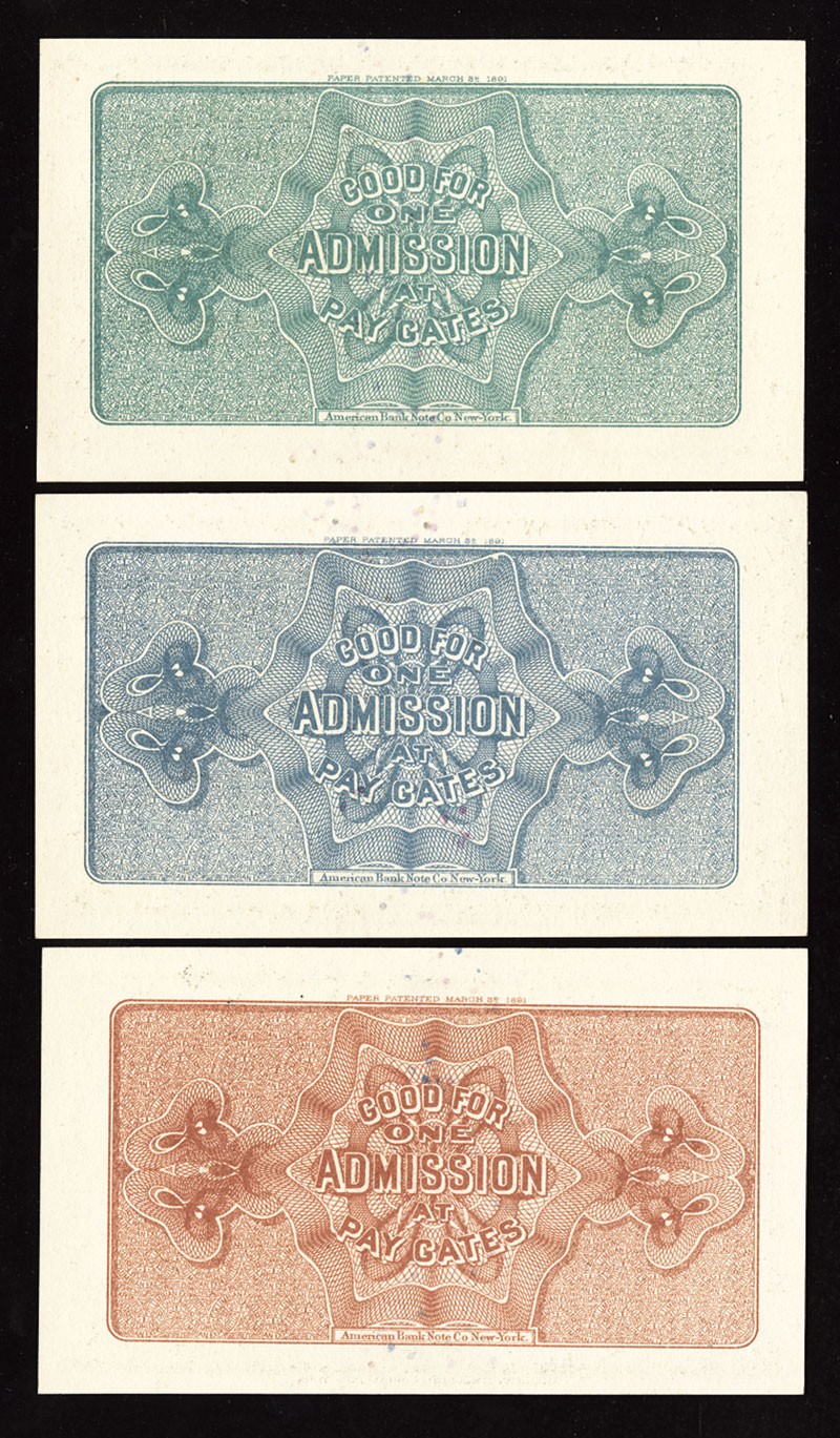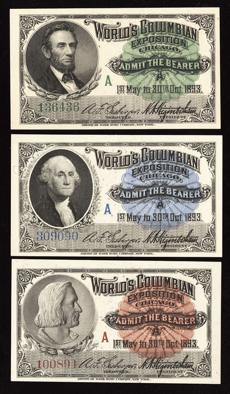 World's Columbian Exposition Tickets.  1)1893. Green. Lincoln. 2) Blue Washington. 3) Brown, Columbus. All Choice Uncirculated. [3]