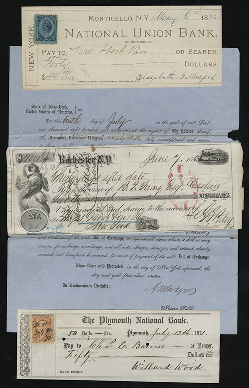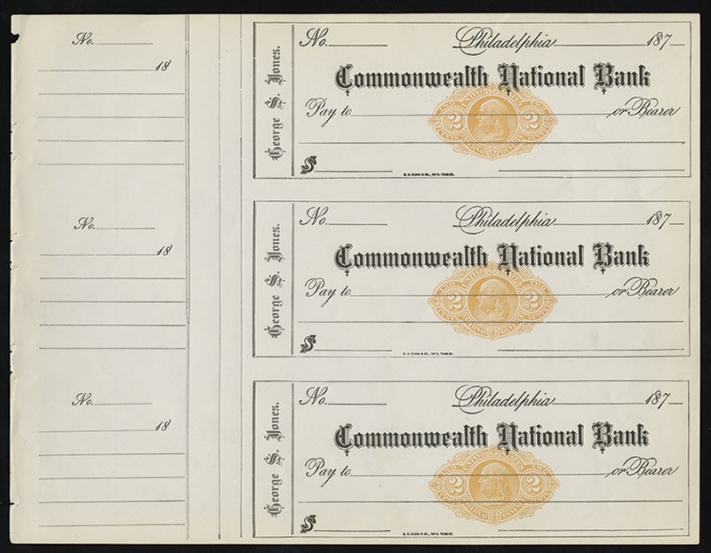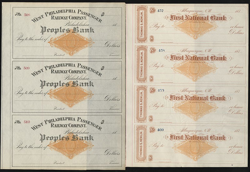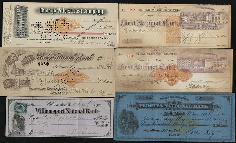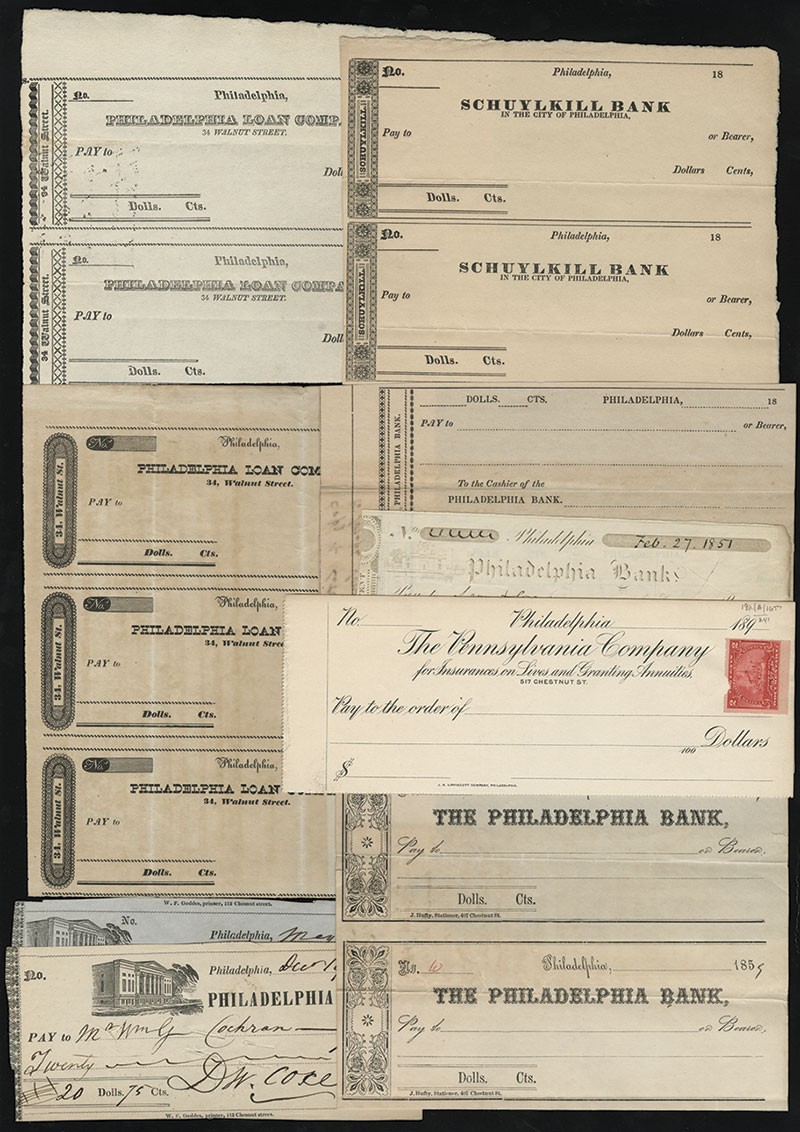 Large and Colorful Grouping of Checks, Drafts and Other Related Fiscal Items. Early checks include Bank of the US, Schuylkill Bank, Philadelphia Loan Company, and Philadelphia Bank. There are uncut sheets of checks with imprinted revenue stamps from First National Bank of Santa Fe, Peoples Bank of Philadelphia, and the Commonwealth Bank. Some nice single checks with imprinted revenues include Downer & Bemis Brewing and the Peoples National Bank of Rock Island plus others. A total of 42 checks in all. Must be seen. Sold as is.