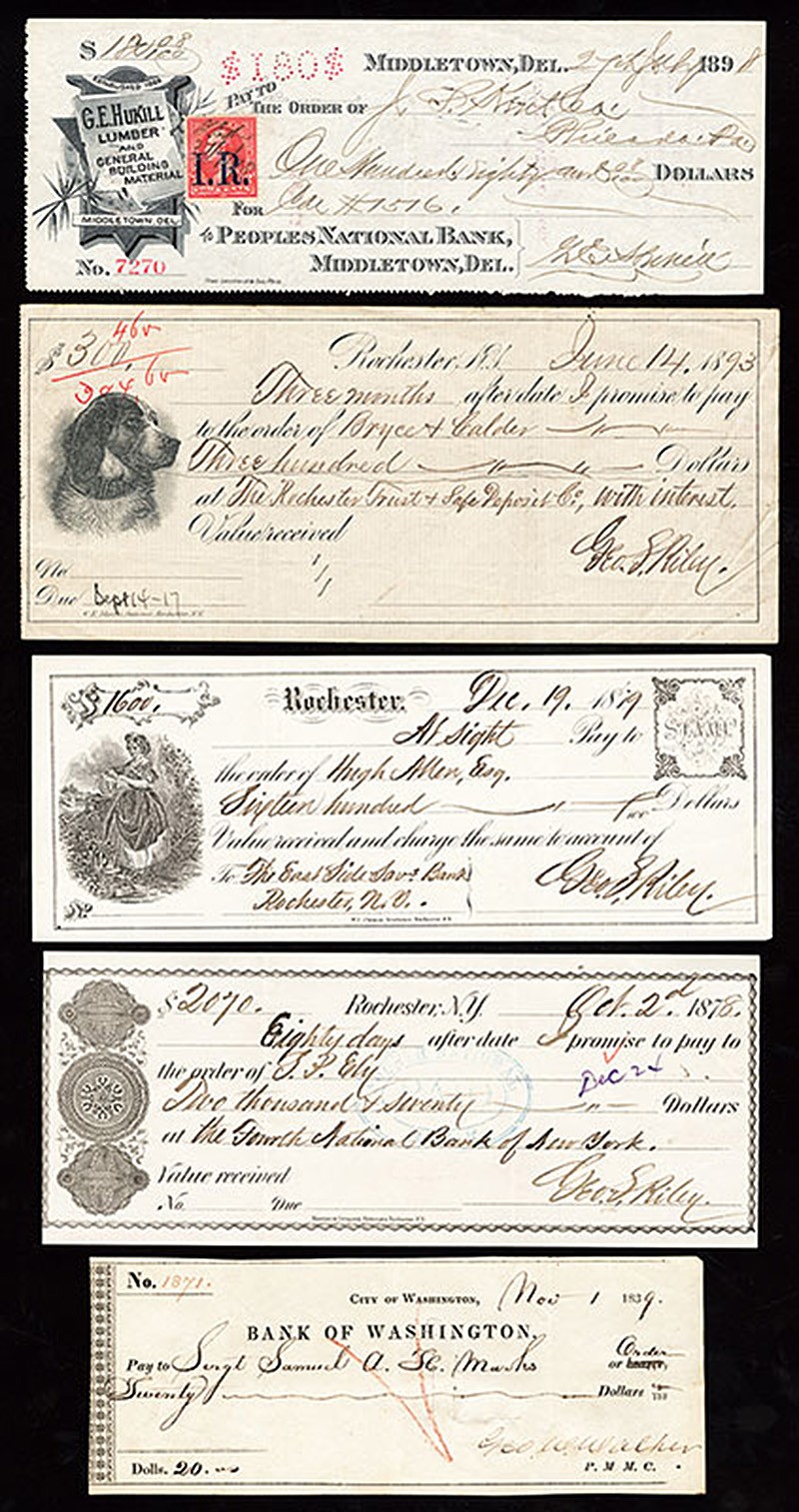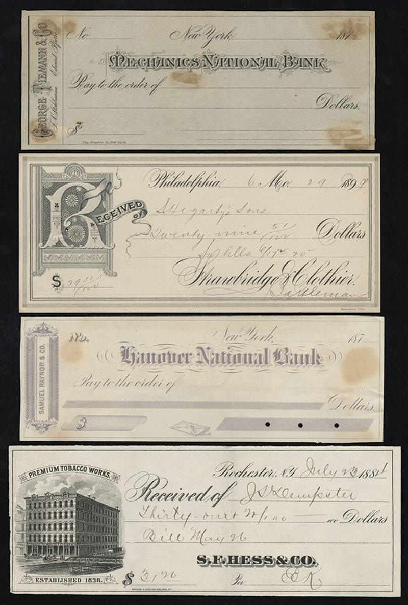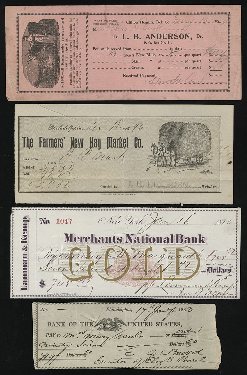 Large and Colorful Grouping of Checks, Drafts and Other Related Fiscal Items. Early checks include Bank of the US, Schuylkill Bank, Philadelphia Loan Company, and Philadelphia Bank. There are uncut sheets of checks with imprinted revenue stamps from First National Bank of Santa Fe, Peoples Bank of Philadelphia, and the Commonwealth Bank. Some nice single checks with imprinted revenues include Downer & Bemis Brewing and the Peoples National Bank of Rock Island plus others. A total of 42 checks in all. Must be seen. Sold as is.