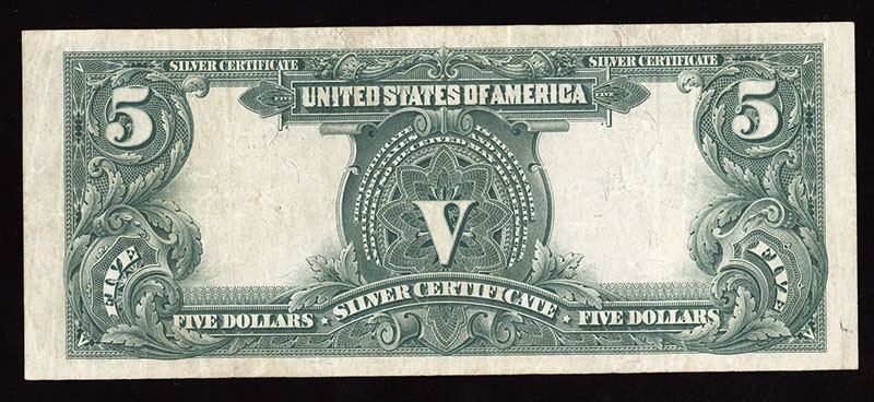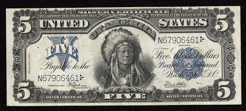 Fr.281. $5. Silver Certificate. 1899. No.N67906461. A. Cheif Running Antelope. F-VF. A boldly printed, nicely centered example. One small ink mark in the lower right margin on the back is mentioned merely for the sake of accuracy.