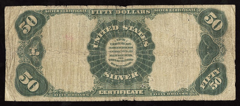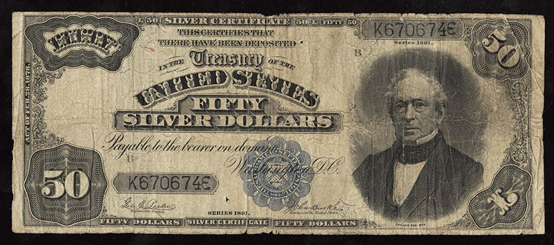 Fr.335. $50. Silver Certificate. 1891. No.K670674. B. Edward Everett. Blue seal. Teehee - Burke. New to the census. Very Good. Several small pin holes and a few larger pin holes. Not a Gem, but these are rarely seen in any grade, and this will fit nicely into a circulated large size type set.