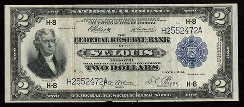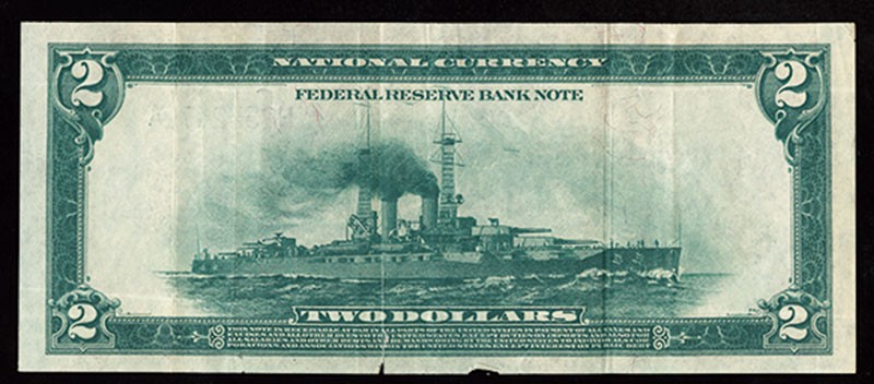 Fr.771. $2. Federal Reserve Bank Note. 1918. St. Louis. Battleship. VF-EF, 1" tear at the bottom, and small chips out of the bottom margin, as well.