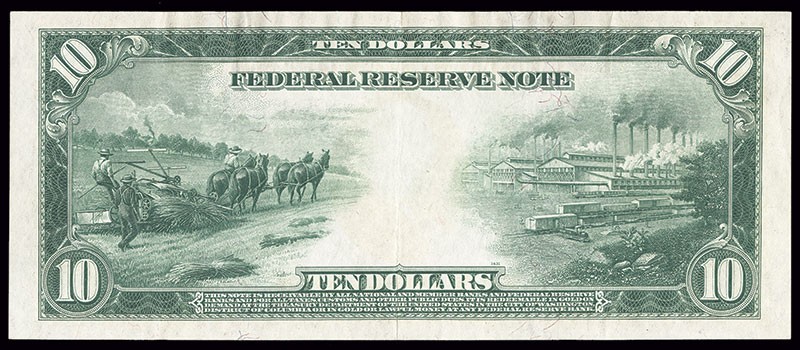 Fr.915A. $10. Federal Reserve Note. 1914. No.C52058907A. G. Philadelphia. Jackson. Blue seal. EF-AU. Fresh and bright.
